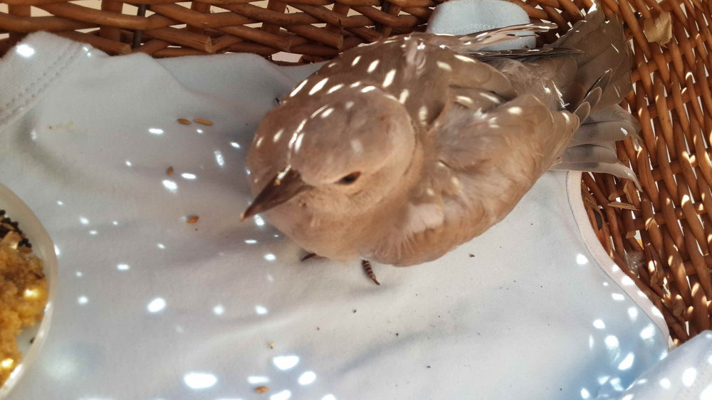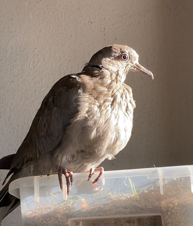 Здравствуйте! История такая: у меня слеток горлицы живёт, подобрала, выкормила. Сейчас оперившаяся птица, летает понемногу, каждый день тренирую, чтоб привыкала к полетам. Сегодня столкнулась со стеклом неудачно, буквально полчаса назад, упала с высоты метра 1.5-2 и после не встаёт на лапки. Крыльями пытается отползти если боится. Вопрос такой - ушиблась или ЧМТ? Реагирует активно, клюет зерна, воду не даю пока. Вопрос: как лечить, чем помочь? Нужны какие-то лекарства? *Фото сделано несколько дней назад.