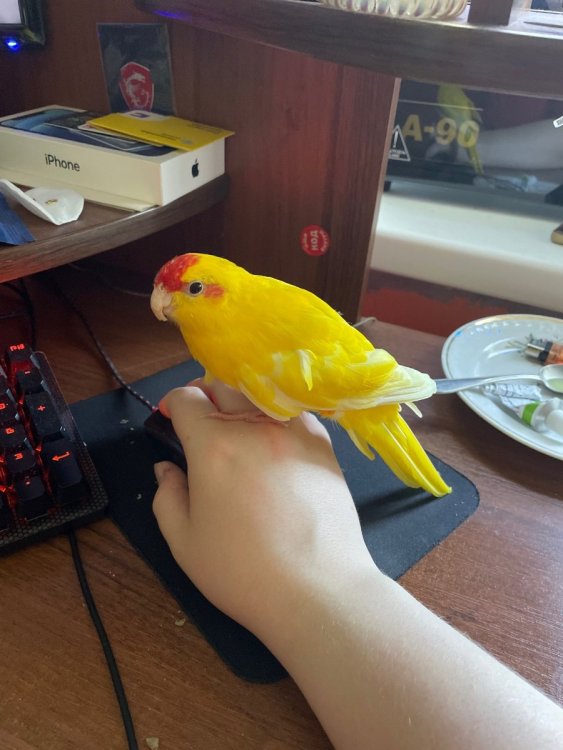1. Здравствуйте. Небольшая предыстория.. Купили себе какарика(мальчик) краснолобик… При покупке нам сказали что птица 1,5г сидела за стеклом, подумали что парниша оживет, будет прыгать и хитропопить как «положено» его виду. Но стоило принести его домой... Как заметили не ладное. Не давал трогать правое крыло и сгибал правую лапу. На след день поехали в ветклинику на рентген, оказалось, что у него перелом правого крыла и правой лапы. Мы немного охринели от такого. Ведь простите, но птица стоила отнюдь не дешево, а тут еще и такой сюрприз. Расстраиваться не стали и вылечили. Парень молодец крыло держал сам правильно, а лапку пришлось зафиксировать (чему собственно он был не очень рад, но стойко терпел). Парень у нас уже 2 месяца, скажите пожалуйста, он просидел 1,5г в клетке и молчал (по словам продавцов, с момента как его привезли в магазин он молчал) Сможет ли парень реабилитироваться и начать так же петь, прыгать и хитропопить? Или эти 1,5г могли дать ему моральную травму? Мы иногда выпускаем его побегать по комнате, недавно начал бегать в припрыжку.. однако у нас шкаф с зеркалом до пола и стоит его выпустить он сразу бежит к нему. На руках сидит, стал забираться сам, но любое движение и он дрожит как осиновый лист. Как еще сказали в магазине, парень семейный и даже как то пытался строить семью с девочкой неразлучником.. однако ж виды разные.. Короче всячески пытаемся развеселить парня.. Кушает отлично, яблоки самое любимое из фруктов, за семечки вообще молчу, водичку пьет. Добавляю витамины в воду. Что делать и сколько ждать не понятно. Может есть тут те кто уже с таким сталкивался.. с птичьей депрессией.. Или как еще это лучше назвать.. Фото нашего засранца прилагаю)