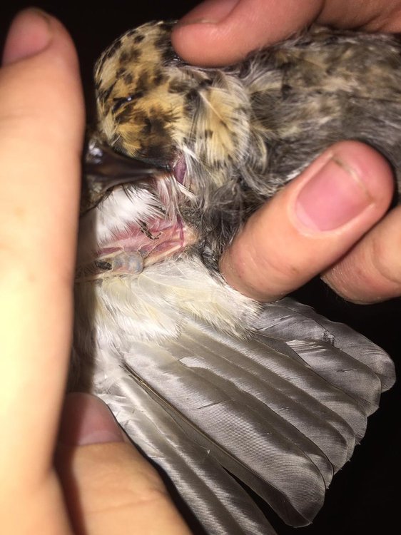 Здравствуйте! Нашли под виноградом мокрую птицу. Гугл подсказал, что это розовый дрозд. Обсох, улететь дать не могу... Летит хорошо, но недалеко и приземляется в траву. Не цепляется лапами вообще, болтаются, но при сгибании чувствуется слабое сопротивление. Аппетит хороший, активно сопротивляется и улетает. Кошка потрепала? Проблема с тазом или позвоночником? Есть ли шансы?