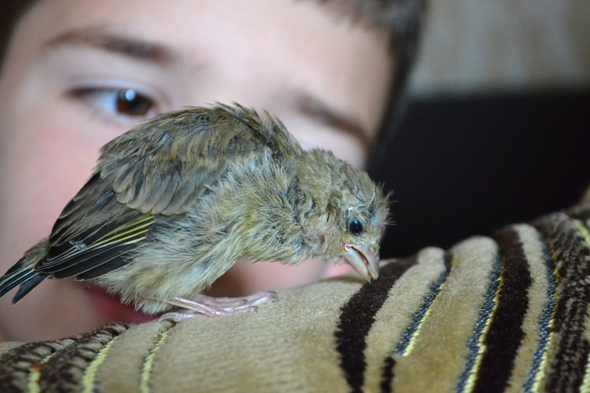 Решила всё же завести дневник. Вот почему бы не сделать это 7 месяцев назад, уже многое забылось. Но лучше поздно, чем никогда. Пройдёт время, и приятно будет перечитать, вспомнить, несмотря на то что писатель из меня никакой. Буду очень рада, если кому-то понравится наша история, пусть и не очень связная. Фисташка В июне 2017 года мы с сыном отдыхали в Трускавце, потом к нам приехал наш папа, и мы ещё поехали на недельку в Карпаты. Оттуда планировали возвращаться сразу в Киев, но все-таки решили, что будет тяжело так ехать, и надо на денёк заехать в Трускавец. Ну что, пожалуй, судьба. Этот денёк для нас вошёл в историю. 1 июля в Трускавце недалеко от бювета, где ходят, без преувеличения, толпы людей, по тротуару бегал и пищал серенький птенец. Пару сантиметров в сторону – и его бы раздавили. Взрослых птиц никаких в зоне видимости не было. Мы с сыном увидели малыша одновременно с группой женщин, одна из которых начала переживать: "Ой, кто ж ты такой? Воробышек? Бедненький. Где ж твои родители? Что ж с тобой делать?" А другие явно были не слишком рады, торопились. Мне подумалось, что как минимум не мешало бы из-под ног на куст пересадить. На сером тротуаре серый птенец точно не жилец. Но когда я подошла и хотела взять его, чтобы перенести в более безопасное место, все завопили в один голос, что нельзя трогать, что родители учуят человеческий запах и откажутся от него. Ох уж эти предрассудки, люди думают, что у пернатых обоняние, как у собаки. Я сказала им, что это неправда, что в птичках чуток понимаю, сказала, что у меня аист полгода в квартире жил. Это действует безотказно! Люди понимают, что перед ними ненормальная, и лучше не связываться. В общем, дамы обрадовались, что птенцом теперь есть кому заниматься, и поспешили по своим делам. Конечно, забирать птенца себе мы не собирались. Мы с сыном начали искать гнездо, но его решительно нигде не было, там вообще рядом были только "омоложенные" деревья без веток. Птиц-родителей тоже не было видно. Отнесли малыша на ближайший куст, отошли подальше, чтобы наблюдать, а он спрыгивал и опять лез на тротуар, и снова приходилось ловить и убирать из-под ног. Потом мы его посадили на ёлочку, там птенчик задерживался чуть дольше, но всё равно оказывался в траве и бежал куда-то, притом каждый раз в разном направлении. При этом он постоянно громко и жалобно пищал. Мы наблюдали издалека, боялись спугнуть родителей, если объявятся. Время от времени подлетали воробьи, но не проявляли к птенцу никакого интереса. Был эпизод, о котором стыдно вспоминать. Я не помню точно, в какой момент это было, но примерно на полчаса мы оставляли птенца на ветке без присмотра, так как у нас было важное дело. Ушли с мыслью "мы поступили правильно, мы сделали всё что могли". Назад бежали, совесть мучила. Когда вернулись, не сразу нашли малютку, опять сидел в траве, весь мокрый. И никаких птиц рядом не было, зато снова появилась на горизонте кошка, которую уже несколько раз прогоняли (она, по-моему, даже не поняла, за что с ней так, ведь была ещё далеко и могла даже не видеть свою потенциальную добычу). Начался небольшой дождь, он намок, замёрз, перестал слазить вниз и пищал уже реже и слабее. В общем, уже прошло много времени с момента, как мы нашли птенца, в общей сложности около 4х часов, родители его не кормили, а я точно помнила, что таким малышам надо часто есть. Мы ус