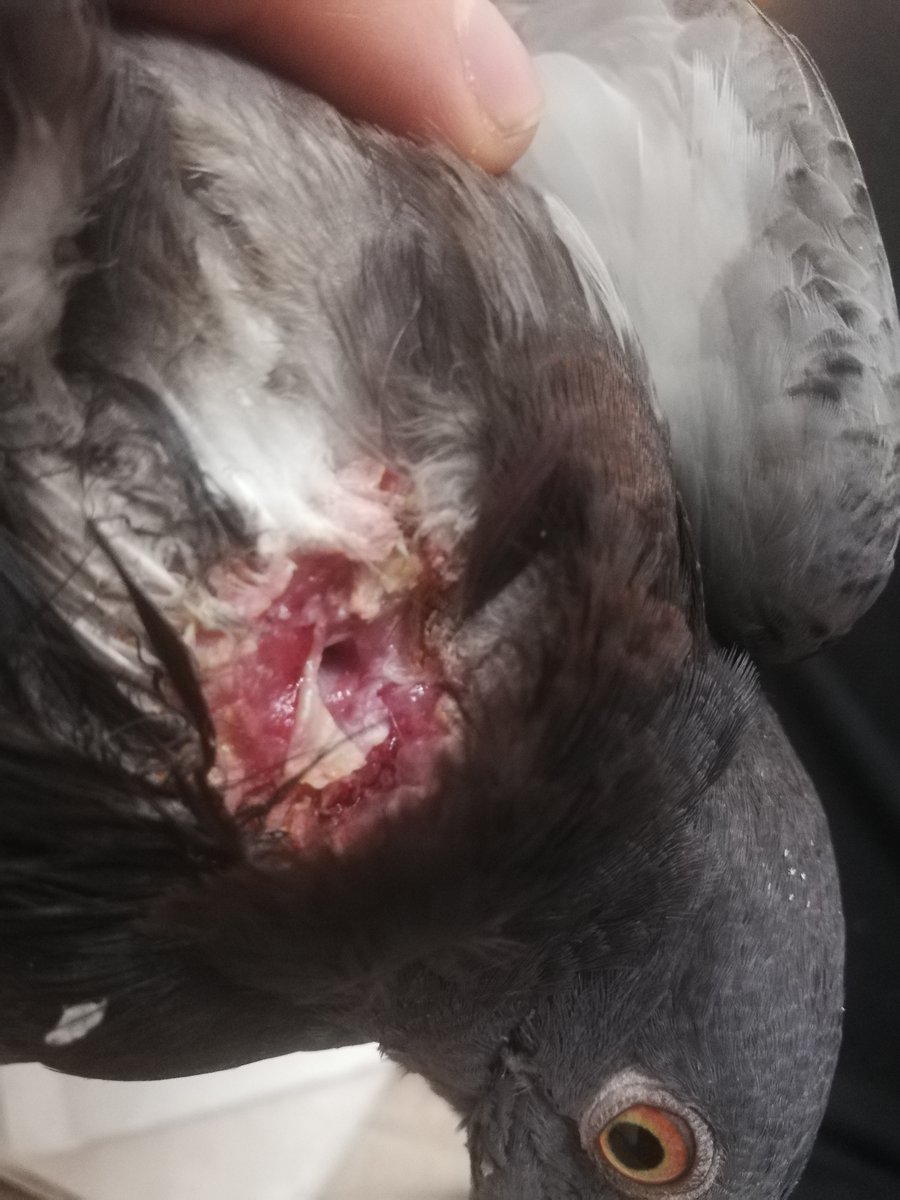 Здравствуйте, подобрал голубя со сломанной ногой в процессе отрофировался и сегодня отпал зоб, просто видно отверстия в шеи, чем в таком случае можно помоч?