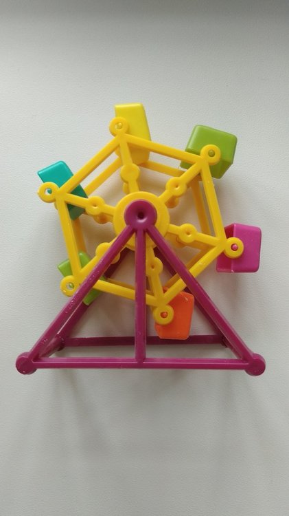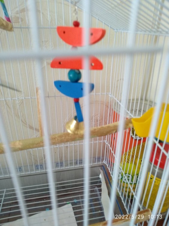 Недели 3 назад купили игрушку неразлучнику. Закрепили не на пол, а на бок клетки. Внутрь кабинок клали вкусняшку, чтобы ему было интереснее. До вчерашнего дня все было нормально, крутил колёсико, раскидывал вкусняшки, иногда садился сверху на боковые жердочки. А вчера он бесился в клетке, пока я собиралась на работу, и влез внутрь между колесом и креплением (как на фото 3). Вперёд не пролезть - узко, а назад - колесо не даёт. Хорошо, что я ещё не ушла и вытащила его.