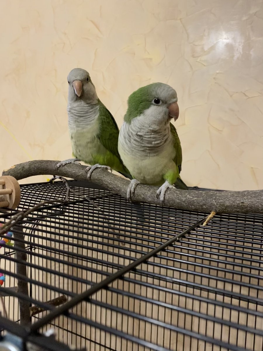 Здравствуйте! Вот и я решилась добавить на форум тему о моих новых детках. Начну с небольшой предыстории: Опыта в содержании птиц ни у меня, ни у супруга нет совсем. В моем далеком детстве у нас дома были волнистики, но, в силу совсем юного возраста, я с ними толком не взаимодействовала, и всю жизнь была больше «по собакам». Совсем недавно мы купили первую собственную квартиру и почувствовали свободу в том плане, что новых членов семьи не нужно больше согласовывать ни с кем, кроме как друг с другом. Как-то вечером я просто «между делом» обронила, что неплохо было бы птичку завести, в довесок к нашей пристарелой той-терьерке. Муж ничего не ответил, а на следующий день приехал с работы с огромной клеткой и нашим Шпинатом внутри… Так получилось, что мы птицу сначала приобрели, а уже потом стали изучать информацию, что, конечно же, совершенно неправильно! Одной из главных ошибок (хотя, сейчас я уже не считаю это ошибкой, а считаю судьбой?) было пожалеть оставшуюся в магазине птичку, ведь они «так дружно жили». На следующий день муж привёз Мяту… Немного о наших пташках: мы из Ростова-на-Дону, объявление о продаже попугаев разных видов муж нашёл на авито, поехал в магазин к «заводчику». С его слов малышам 2-3 месяца, покрупнее - мальчик, помельче - девочка, но доподлинно ничего о них неизвестно, тк ни колец, ни каких-либо других документов в наличии нет?????. Уже в процессе «штудирования» этого прекрасного форума я убедилась в том, что птицы мои совсем не птенцы (судя по клювам, лапкам и оперению). «Заводчик» уверял, что малыши абсолютно ручные, выкормыши, но выкармливал не он?. Спустя два дня тщетных попыток дать угощение с руки я спросила мужа, как наш «заводчик» ловил птиц в магазине, на что он сказал - руками, а птицы в это время метались по клетке, как сумасшедшие??. Стало понятно, что нас надурили по всем пунктам, но, делать нечего, работаем с тем, что есть, ведь мы в ответе за тех, кого (пока что не) приручили! Первые 2 недели, признаюсь, было непросто. Даже были мысли отдать одну птицу родителям, тк знающие люди убедили нас, что в паре мы никогда их не приручим. Завтра будет 3 недели, как у нас появился Шпинат, во вторник - 3 недели, как дома и Мята. На сегодняшний день оба птыца абсолютно спокойно кушают с руки, позволяют мне что-то делать на их территории, ни разу меня не кусали, не шипели, но были очень осторожны и жутко боялись любого шевеления рукой в их сторону. Со вчерашнего дня Мята прилетает на руку за вкусняшками, Шпинат пока берет только с плеча. Погладить или почухать еще никто не дался, но я уже чувствую, что этот день не за горами?. Клетка у детей просторная, в наличии жёрдочки, лесенка, качели, игрушки. Кушают зерносмесь (Versele-Laga для средних), пророщенное и замоченное зерно, обожают яблоки, семена тыквы и подсолнечника (дозируем), сенегальское просо. Пекинская капуста идёт со скрипом, огурец, морковь, груша и банан не понравились. Выращиваю им травку на подоконнике, стригу в миску с проростками. Регулярно снабжаю грызунов веточками берёзы, ивы и яблони. Минеральная смесь и камень всегда в клетке. Уф-лампа для птиц имеется. Вчера, когда Мята впервые прилетела мне на руку, я от счастья чуть не запищала?. Поняла, что лёд между нами растаял, сегодня Мята прилетала уже несколько раз. В планах: когда птицы привыкнут к рукам посетим ветеринара, сдадим анализы и, скорее вс