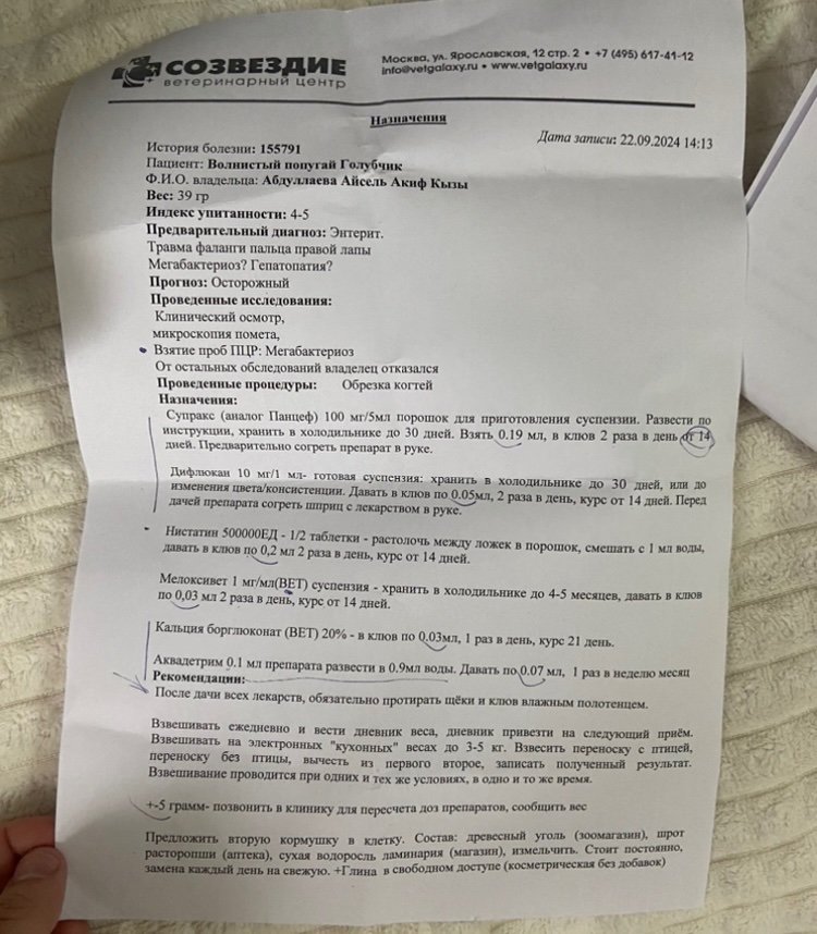 Здравствуйте! 03.04.2023 года был подобран голубь, сидел на нашем окне. В ходе осмотра никаких внешних ран не обнаружено, выделений из носа и глаз нет, но зоб был, как пластилин. Вес на момент обнаружения 280 грамм. Кормили гречневой кашей через шприц 30 мл - 4 - 5 раз в день. В этот же день было начато лечение: Нистатин 500 000 ед. 1/4 таблетки растворяем в 2 мл воды (предварительно смыв оболочку) - 3 раза в день. Флуконазол 50 мг растворяем в 5 мл воды - даём 0.4 мл 2 раза в день. Орнидозол 500 мг 1/4 таблетки (предварительно смыв оболочку) растворяем в 5 мл воды - даём 0.4 мл 2 раза в день. Карсил 1/2 таблетки (предварительно смыв оболочку) - 2 раза в день. Закупорка зоба все это время не проходила, на утро вся еда не уходила из зоба. В ночь с 08.04.2023 на 09.04.2023 была сильная закупорка зоба, и пришлось давать вазелиновое масло. С 09.04.2023 изменили схему лечения: Нистатин 500 000 ед. 1/4 таблетки растворяем в 2 мл воды (предварительно смыв оболочку) - 3 раза в день. Флуконазол 50 мг растворяем в 5 мл воды - даём 0.4 мл 2 раза в день. Орнидозол 500 мг 1/4 таблетки (предварительно смыв оболочку) растворяем в 5 мл воды - даём 0.4 мл 2 раза в день. Карсил 1/2 таблетки (предварительно смыв оболочку) - даём 2 раза в день. Амоксиклав 500+125 мг 1/2 таблетки (предварительно смыв оболочку) растворяем в 4 мл воды - даём 0.5 мл 2 раза в день. Гепатовет - даём 0.3 мл 2 раза в день. После того, как считали давать Амоксиклав еда стала уходить из зоба. И на утро зоб был пустой, но в зобу утром стали скапливаться ГАЗЫ, которые выходили через клюв, после массирования зоба. Сейчас кормим гречневой кашей через шприц 30 мл 4-5 раз в день. Вес голубя на данный момент 280 грамм. Подскажите, пожалуйста, какие лекарства надо ещё добавить в схему лечения, чтобы прекратить газообразование в зобу и полностью вылечить голубя. Фото голубя: Фото сегодняшнего и вчерашнего помета: