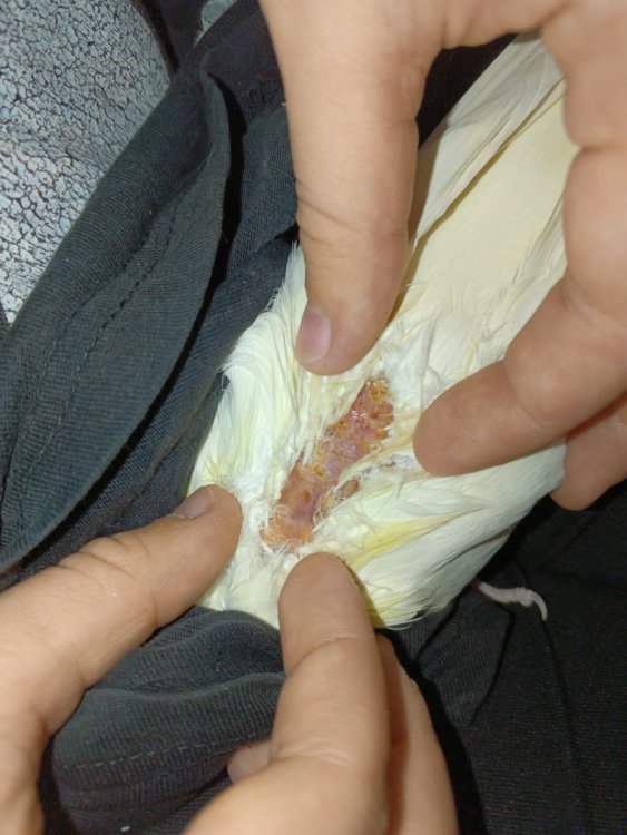 здравствуйте, у нас в городе нет ветеринаров, занимающихся птицами, поэтому приходится писать сюда. +- неделю назад заметили, что он начал пищать во время того, как чешет спинку. не понимали в чем дело, сейчас решили посмотреть, залили хлоргексидином, рана размокла и стало видно вот это. помогите, пожалуйста. подскажите, что это может быть и что делать? кушает хорошо, активный, помет вроде нормальный.. не знаем что думать. кушает корм рио для средних попугаев, в рационе есть минеральная смесь и, также висят в клетке минеральные камни. даем морковку, огурцы, яблоки и иногда сладкий перец.