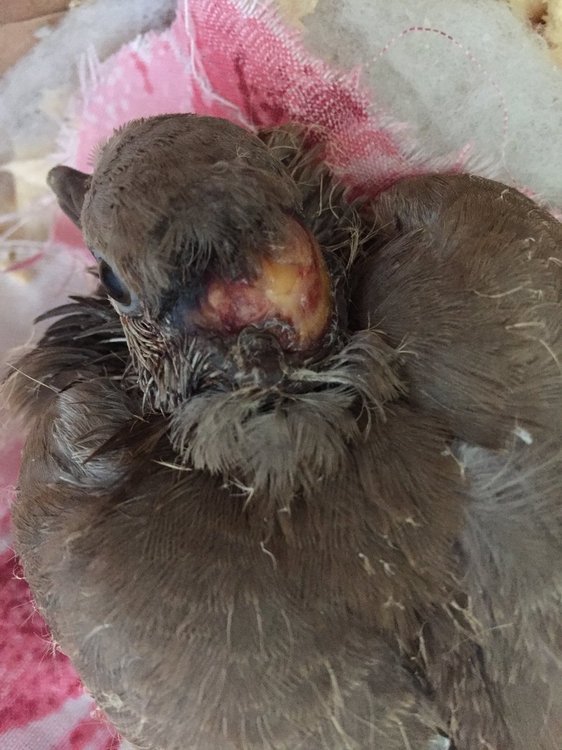Здравствуйте. Помогите, пожалуйста, советом. Описала все по вопроснику, сейчас посмотрела нарыв как бы увеличивается. Скажите, пожалуйста, а можно ему эту ранку мазью Вешневского помазать, чтобы гной вытянуть? Заранее очень благодарна за ответ. Да, я ранку утром и вечером мажу Метрогил Дента и раствором Люголя с глицерином, поочередно . И еще - мне сказали, что ему надо давать размоченную кукурузу 21 зернышко за прием - он не перест? Его вес около 180 гр Голубь 3. её возраст и пол; 1 мес, точно не знаю, живет у меня 2 недели, сам подошел ко мне на улице и сел на босоножку, а рядом его кот дожидался, не смогла уйти 4. подробно распишите рацион (с указанием названий кормов и витаминных препаратов) - Давала до 11.07 довольно крутую кашу Хайнц без молока, туда добавлю просо и рапс, развожу кашу чиктоником, добавляю еще немного натертого яйца и измельченной скорлупы. Сейчас голубенок сам не ест(давала в отрезанном шприце, он туда клюв опускал и ел. Теперь, с 11.07.18 кормлю размоченной в воде пшеницей(где-то 1 десертную ложку, удается в него впихнуть) 5. опишите условия содержания птицы (температуру и влажность воздуха в комнате) и длину светового дня – птиц живет на лоджии, температура воздуха -25-27 градусов 6. опишите настораживающие вас симптомы Была 2 дня назад на подклювье(внизу) был какой-то нарост или шишка темного цвета, теперь вот такая ранка, а точнее нагноение Голубенок стал очень плохо есть, наверное, больно, приходится докармливать, сам клевать еще не умеет 7. напишите, как давно птица болеет - увидела ранку 10.07.18 вечером 8. если птицу уже лечили то, пишите даю 2 раза в день юнидокс салютаб 1/6 таблетки и нистатин ? таблетки развожу в 5мл и даю 0,2 кубика утром и вечером 8.1. какие исследования, где и как давно проводились 2 дня назад сдавала в лаборатории исследование на простейшие и ооцисты - не обнаружены, отмечается обилие бактериальной флоры! Палочки 11-13 пз, кокки больше 100 пз 8.1.1. каковы их результаты; Результатов пока нет, ранка даже больше стала 8.2. какие препараты, в каких количествах и как долго применялись начала давать 11.07 юнидокс салютаб - 1/ 6 таблетки и нистатин 0,2 куб инсулинового шприца 2 раза в день 8.3. каковы результаты лечения. Пока нет