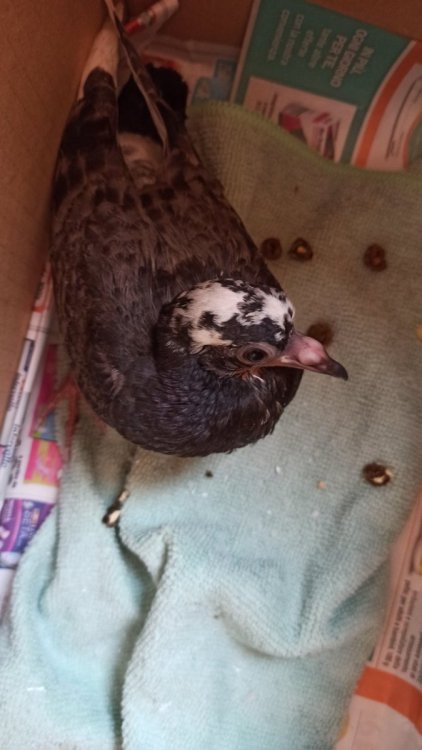 Гуляли с собакой в Москве, в сквере, собака маленькая дворняжка, не агрессивная, без поводка. Вдруг встрепенулась, начала что-то искать и нашла его (или её) в траве по щиколотку. Птенец не шевелился, но собака взяла его в пасть, вероятно, могла и прикусить, но только тогда он начал вырываться, и мы смогли заметить его. Я сразу отозвала собаку, мама пошла осматривать находку, без явных повреждений. Поблизости голубей не было, на улице жарко, найдёныш еле дышал и из рук уже не вырывался, совместным решением было принято забрать его домой, напоить, накормить и не дать умереть на улице. Первым делом приобрели клетку (42х30х37 см), чтобы изолировать от двух домашних собак. Зерно не ел, но немного попил, на следующий день не умер. По-прежнему не ел, перестал сам пить, купили шприцы (по 20 мл), насадили на шприц без иглы 5 см трубку от капельницы, начали насильно (но аккуратно, ведя трубку поверху, чтобы не задеть трахею) кормить отваренной пшеницей с Бифидумбактерином (без сахара, на кончике ножа, добавляем в кашу). Трубка проходит, зоб наполняется, за 3 часа почти полностью опустошается. Пернатый семь дней таким образом уже держится за жизнь. В местной ветклинике администратор сразу сообщила, что с голубем нам не будут рады, на ваше сообщество я тоже наткнулась случайно вчера, когда появились симптомы, требующие внимания и лечения уже у специалиста. Почитала несколько тем на вашем форуме, увидела, что помогаете, да ещё и волонтёры (с опытом и/или с образованием), и решила тоже попытать удачу вместе с вами. Опыта в выхаживании птенцов, тем более голубей, у нас не было, но крошка выжил, и мы просим вашей помощи в дальнейшем лечении. Пишу по памятке, что нашла в другой теме, но если я что-то упустила, то, пожалуйста, поправьте меня, и я дополню всё необходимое. 1. Кровотечений в т.ч. из клюва или клоаки на данный момент нет. Было разовое подкравливание из клюва при неосторожном кормлении. Дала раствор крапивы после, больше не повторялось. Царапин на теле не было и нет. 2. При поимке на лапах не стоял, сейчас может стоять на одной лапе, тело при этом шатается, неустойчив, но уже старается не лежать. Неестественное обвисание второй лапы. Видимых переломов не обнаружено, но, к сожалению, у меня не глаз рентген, а в ветклинике меня развернули с голубем. Буду благодарна, если посоветуете ветклинику, а лучше конкретного специалиста, где нас примут, денег на рентген не жалко, тем более имеется гематома в бедре поврежденной лапы. Есть надежда, что ушиб и дефицит питания, сама лапа за неделю цвет не изменила. Могла травмировать и наша собака, когда нашла его, или кто-то до нас, но если бы она его не подняла, то и мы бы не увидели и прошли мимо, так что это она его первая спасительница. 3. Голова в естественном положении, признаков «вертячки», ходьбы по кругу, опрокидывания за неделю не обнаружено, походка шаткая (но она хотя бы появилась, уже радует). 4. Глаза при поимке не открывал. Протирали каждый день по два раза ватным диском, смоченным в Мирамистине, почти сразу открыл один глаз, глаз не мутный, видит им хорошо. Второй глаз открывает редко, предпочитает держать закрытым, глаз слезится, воспален, не мутный, но присутствуют творожистые выделения. За неделю Мирамистин справился только с одним глазом, со вчерашнего дня в лечение добавлены капли глазные Тобрекс 2 раза в день по 1 капле в каждый г