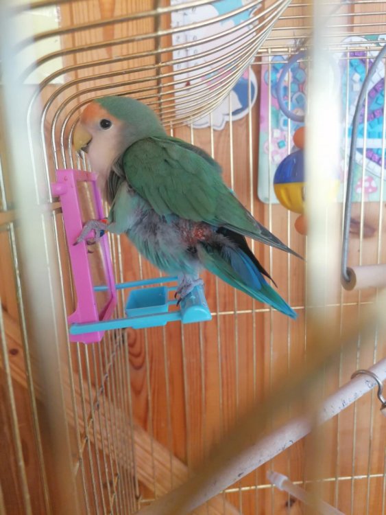 Добрый день! Неразлучник, ориентировочно 2 года (мы его забрали в добрые руки). Клетка большая, вода из фильтра, корм Рио для средних птиц, в период линьки даём Рио для линяющих, овощи, фрукты каждый день, веточка яблони всегда в клетке, также даем веточки смородины, но их игнорирует, камень минеральный висит в клетке, даём ежедневно пророщеную травку(посмеялись в землю корм). Гуляет каждый день, летает мало, больше любит на людях сидеть. Сегодня утром увидели кровь на полу клетки. Выпустили Бантика, чтоб осмотреть и обнаружили под крылом какую-то расчесаную болячку. Попугай нервничает, чешется. Чешет как болячки, так и крыло, под которым она. Сейчас ищем орнитолога рядом, но хочется помочь питомцу побыстрее. Фото прилагаю