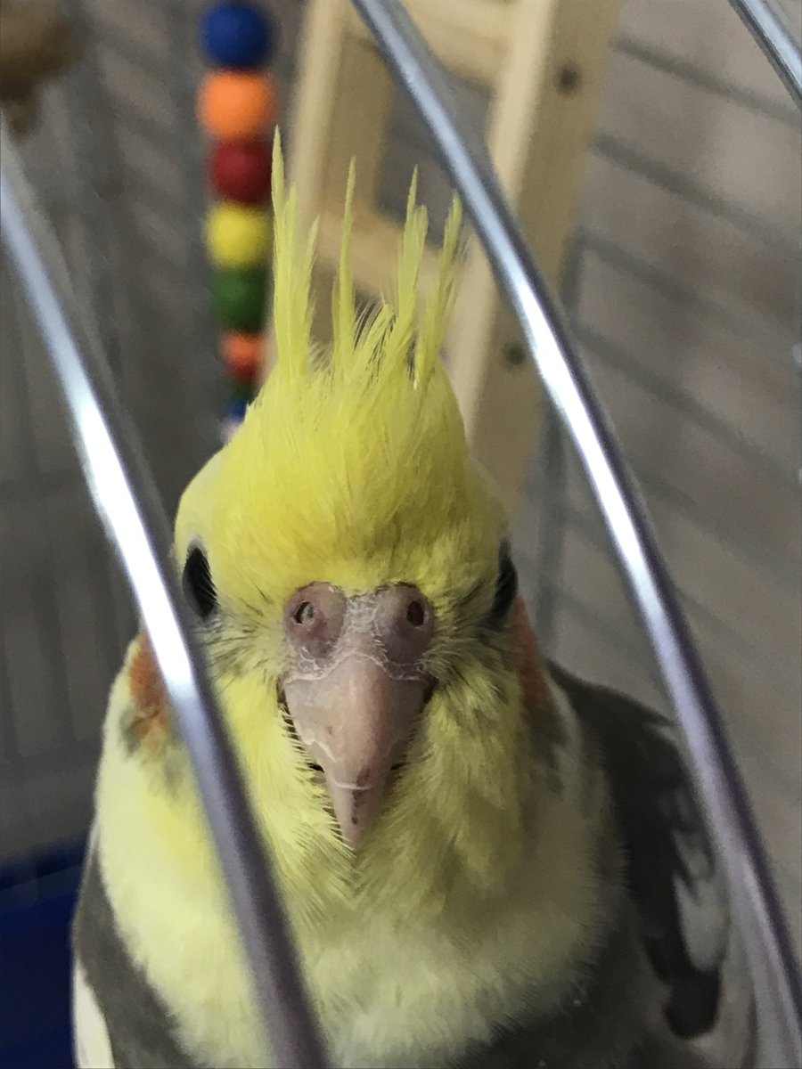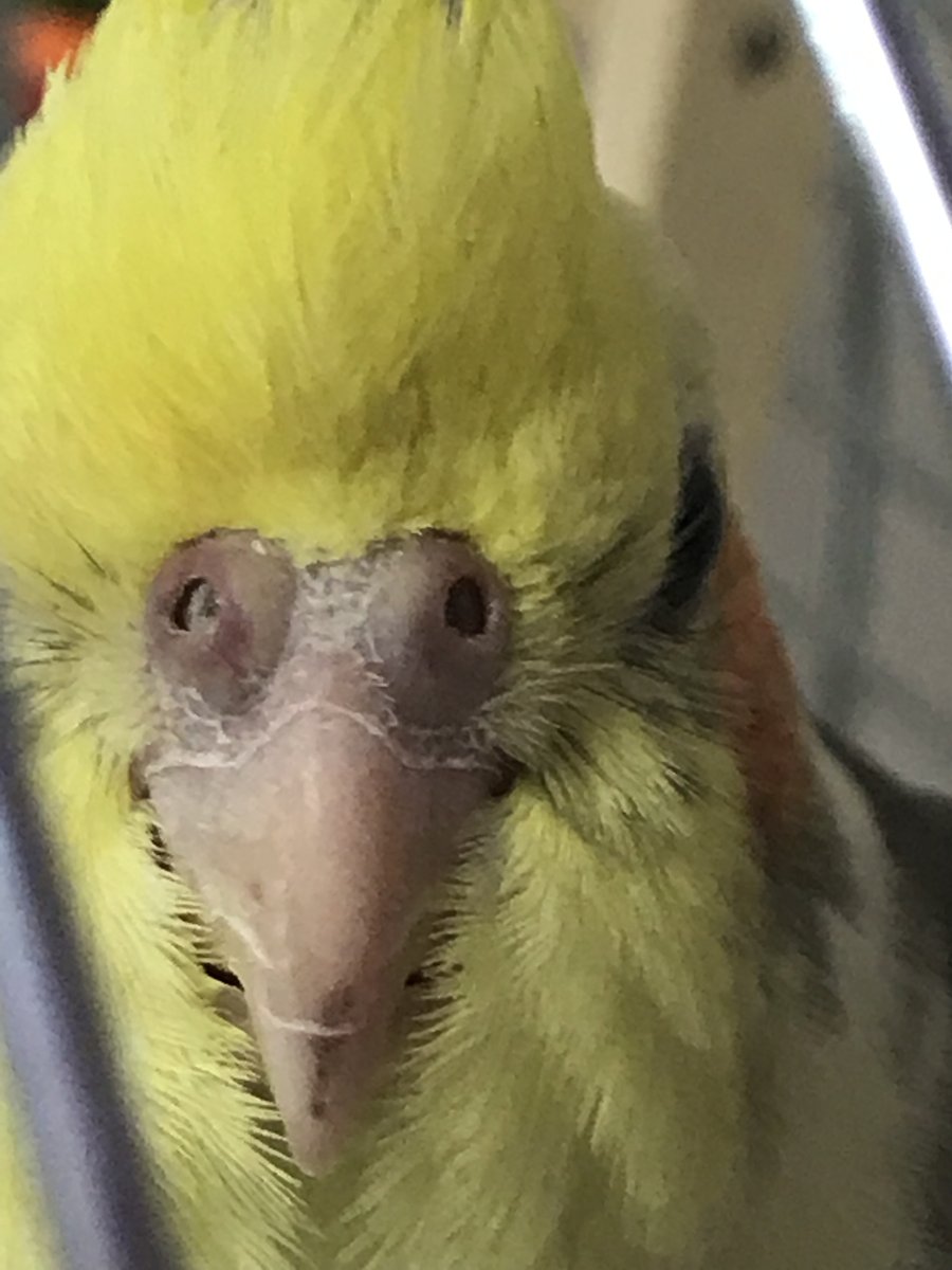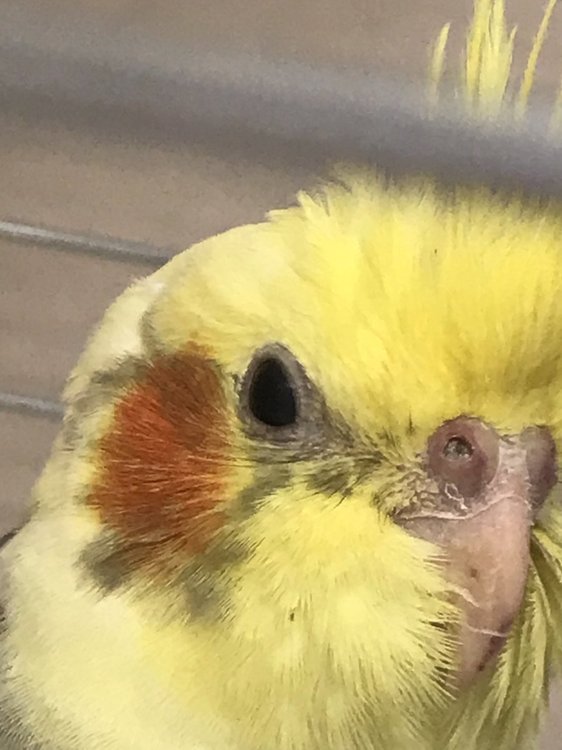Помогите пожалуйста определить приблизительный возраст и пол нашего кореллы, купили 3 дня назад, нам сказали что ему ещё нет 2х месяцев, но меня смущает его клюв, на фото видно.