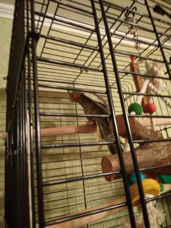 Доброго времени суток. Сегодня взяли кореллу, по словам продавца 2 месяца, но что - то не верится. До этого попугаев не было, но перед тем как завести много читала. Вроде бы это мальчик, до 5 месяцев, постараюсь приложить фотографию. Может кто помочь определить возраст поточнее? Ещё интересуют советы: какой корм лучше давать, может нужно смешивать какие либо? Я посеяла его корм, можно ли ему давать пророщенную зелень так рано? Чем ещё дополнить рацион? Нормально ли то, что он нахохлился на верхней жердочке и как мне сменить их на веточки, для его удобства, если говорят, что лучше не лезть к нему в клетку сейчас? Ещё начиталась о том что им нужно купаться и ставить УФ лампы и дополнительное освещение, как часто его купать и когда начинать обрызгивать его и ставить лампы? Заранее спасибо за помощь! На фотографиях вечер, на попугая не попадают прямые солнечные лучи, это лампа. Ещё вопрос, не заходить в комнату где он стоит не получается, можно ли потихоньку занимаясь делами с ним беседовать? P. S. Когда я подошла, он обернулся и стал за мной наблюдать, часто протягивая крылья, как бы разминая, то одно, то другое. Не знаю может ли он летать, когда можно будет проверить и начать обучение?