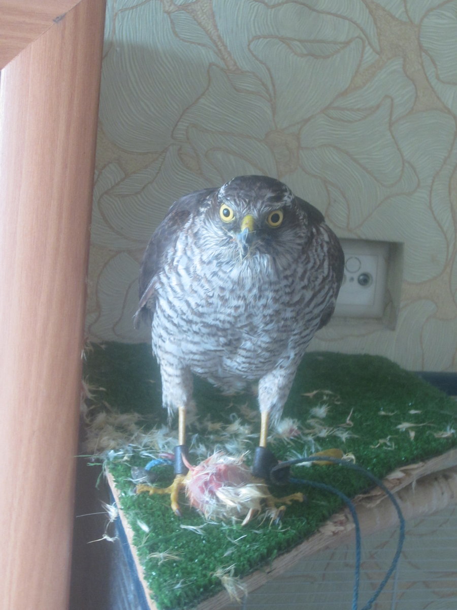 Здравствуйте! Я новичок тут. Появилась у меня недавно перепелятница. Забрал годовалую у прошлых хозяев. Но с хищами у меня опыта мало, в основном серыми воронами занимался (на даче живет ворона Герман, ему 4 года, но речь не о нем, это так, к слову). Яся ест пока что суточных цыплят из морозилки (в ближайших планах покупка перепелок), нужно ли ей давать витамины? И по поводу линьки - брызгаю из брызгалки несколько раз в день, общаюсь, практически все время сидит на руках - видел информацию, что ястребы без общения во время линьки быстро дичают. У нас драный хвост - не знаю, как птичку содержали до меня. Как лучше перелинять и какой режим кормления должен быть во время линьки? Есть возможность гулять на балконе, на улицу пока не рискую выносить, тк наверное стресс. Чувствует себя хорошо. Летает со шкафа на присаду, с рук на присаду и с присады на шкаф, несмотря на драный хвост. Не кусается вообще никак. "Дом" у Яськи такой - мини-вольер от вороны (без крыши) ниже меня на голову, ибо не знаю, как еще сравнить, на самом его верху что-то типа присады и в углу дощечка для еды, покрытая астротурфом. Весь помет летит вниз в вольер, на полу наполнитель, который периодически подвергается замене. При мне есть не начинает, с рук тоже не берет, но стоит выйти из комнаты - прилетает на дощечку и начинает потрошить еду. Если захожу - нормально кушает, на меня внимания практически не обращает. Как научить есть с рук? И не купается при мне. Да и как лучше обустроить ей жилое место? Вольерчик убрать возможности нет, скоро приедет веревочка пенька, которой обмотаю эти насесты. Лучше пеньку или какой-то другой материал? p.s. розетка и прочее на стене - нерабочее, риска повреждения птицы электротоком нет. p.p.s. где-то на форуме была еще перепелятница - наша тезка. Прошу помощи у опытных форумчан, потому что хочется сделать жизнь птицы максимально комфортной.
