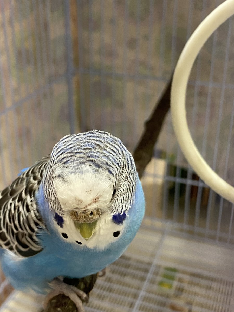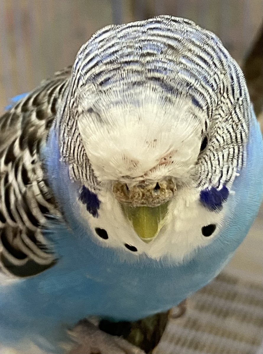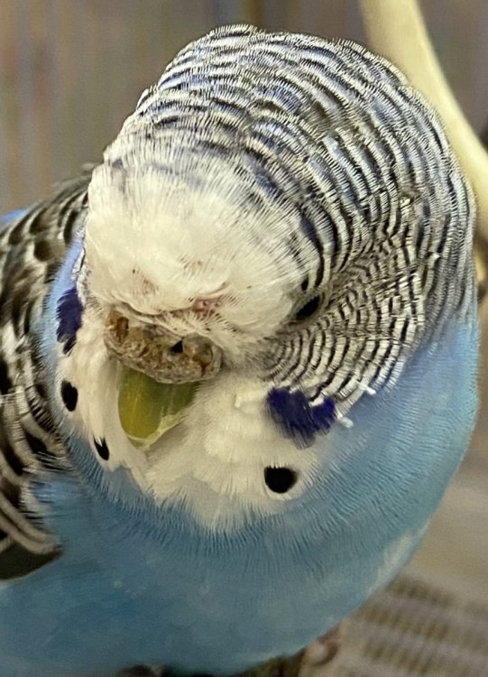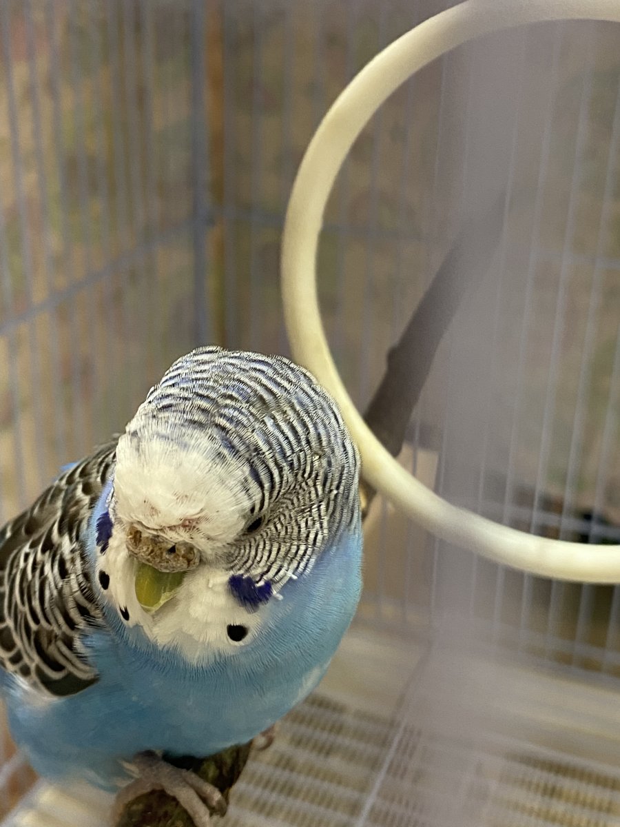 здравствуйте, утром заметила у попугая красные пятнышки над восковицей, в итоге по фото поняла что это перья опали, а сама восковица как-бдуто треснула. возраст: 2 год (примерно) пол: самка в последнее время стала очень тихой, возможно ей скучно. сделала ей новую игрушку, пока не играет. к орнитологу ходила месяца два назад, этой проблемы не было, но про восковицу сказал, что это нормально для самок. в этой позе она все время сидит. никак не могу приручить ее