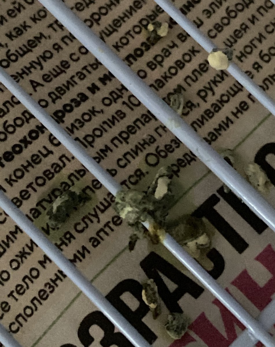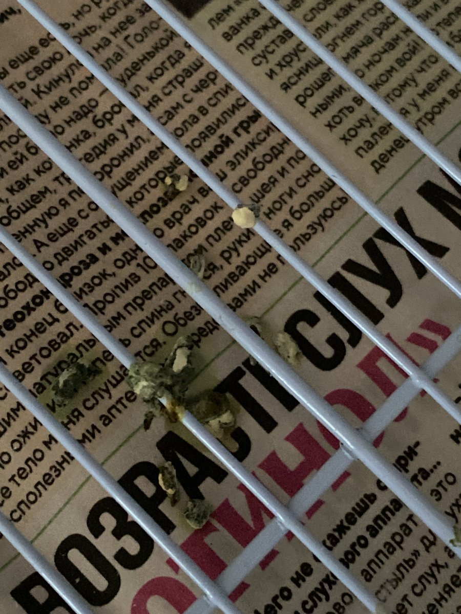 У попугая на теле твёрдые белые столбики ближе к хвосту и под крыльями, много. Он их сам дёргает, мы не знаем, что это, перья или что-то ещё. Попугай после болезни. Ест кормовую смесь рио, минеральную смесь, пьёт витамины юнитабс. Помёт большой и редкий.