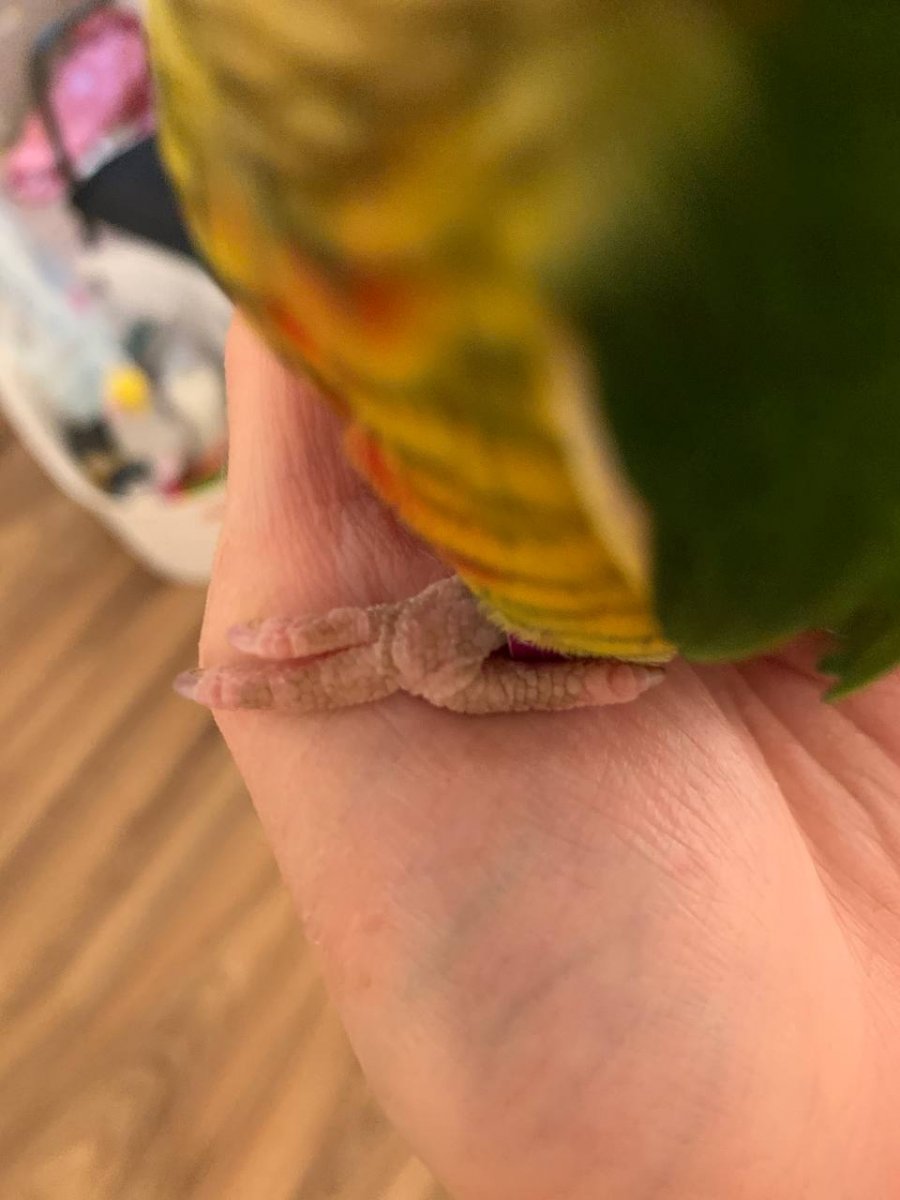 Здравствуйте! У нас живет пятимесячный попугай Олеша (пол в процессе выяснения), сейчас у него первая линька. Хочу проконсультироваться по поводу клюва (ощутимо слоится и не очень ровный по краям: ок ли это во время линьки?) и цвета лапок: со временем розоватая кожа как будто "покрылась" серым цветом — не равномерно, а так, местами. Выглядит как будто налет или грязь (купается регулярно). Окольцованная лапка — там где кольцо — как будто бы более серовато-сизая, чем другая. Стоит ли беспокоиться? Фото прилагаю. Спасибо!