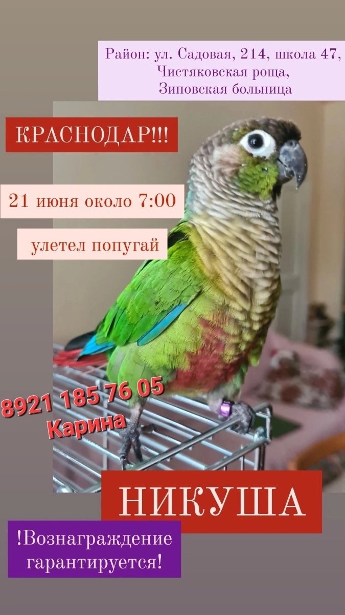 КРАСНОДАР Добрый день! 21 июня, около 07:00 вылетел в окно попугай по кличке Никуша. Адрес: Садовая, 214, район Зиповской больницы, Чистяковской рощи. Сейчас может быть и в других районах. Попугай среднего размера, без хвоста около 15 см. Домашний, полуручной. НЕ разговаривает. Огромная просьба сообщить, если вдруг увидите или залетит к вам в окно! 8921-185-76-05 или 8928-439-43-52 ВОЗНАГРАЖДЕНИЕ ГАРАНТИРОВАНО