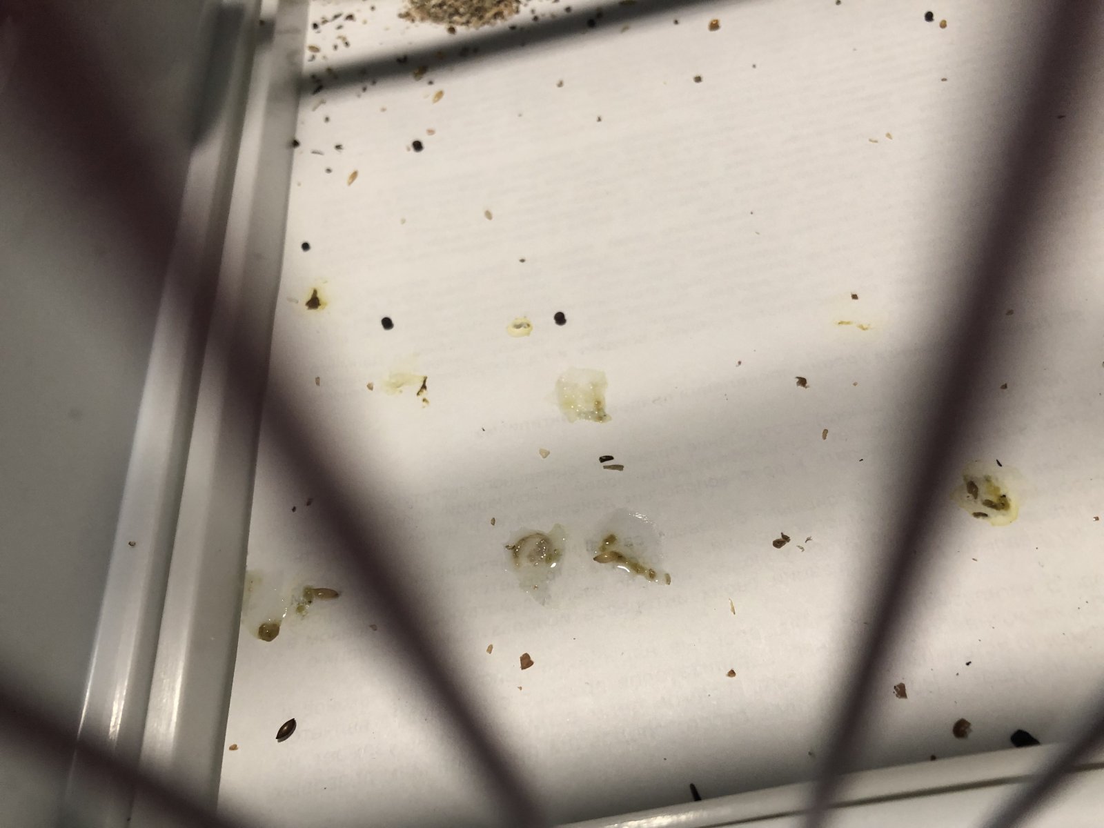 здравствуйте! 1. безщекая корелла 2. самец 3. 1,5 месяца 4. корм Rio, который он не кушает в силу возраста, но может пару раз поклевать, каши(овсяная, кукурузная, гречневая, рисовые хлопья), яблоки, желток яйца, заводчик кормил пшеном. 5. клетка 60?40 прямоугольной формы, в комнате работает увлажнитель по ночам, поэтому днем влажность 40-50, ночью 70, температура в комнате +20-23°, световой день с 8 до 22 6. сонливость, большое содержание воды в помете, помет зеленый, прилипает к хвосту и тянется 7. 2 день 8. лечение не применялось _______ вчера забрали выкормыша кореллы возрастом 1 месяц и 13 дней у заводчика, говорил, что хорошо все кушает, что оказалось не так. малыш вечером погрыз немного яблока, мы подумали, что он не голоден и посадили на сон в клетку, утром клетка была в зеленом помете, с вечера все было в порядке, червячки были светло коричневые, но жидкости все равно слишком много. с утра предложили ему привычное пшено и корм, которые он даже не смог разгрызть т тут мы поняли, что что-то не так. сварила ему яичный желток и овсянку на воде - покушал совсем не много, начал ходить в туалет совсем водой. сейчас решила покормить его с рук, покушал хорошо, съел всю овсянку, не с рук есть отказывается, как понимаю, совсем малыша нам продали... птичка постоянно сонная. написала об этом заводчику, он сфотографировал помет второго птенца выкормыша кореллы и малыша розеллы(им по 1 месяцу, содержатся в одной клетке), помет не жидкий но такой же зеленый, что воспринимается заводчиком, как нормальный и обычный. подскажите, пожалуйста, что делать в данной ситуации и что это может быть? Ps : заводчик гуляет с малышом кореллы на улице, есть вероятность, что что-то мог принести с ним. взрослых птиц у заводчика нет, покупает яйца и сам выкармливает птенцов. 1,2 фото - помет моего птенца 3 фото - помет птенцов заводчика 4 фото - сам птенец
