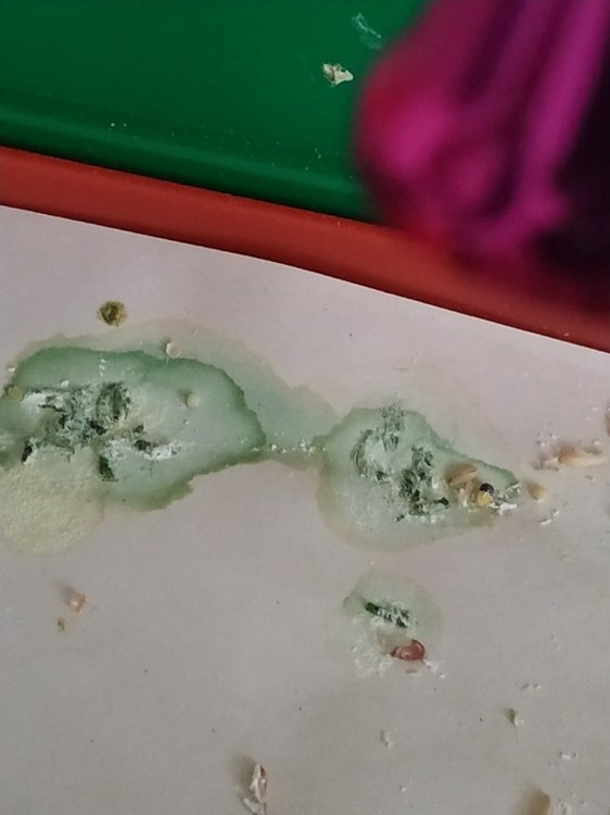 Добрый день. Заболел попугайчик, вчера днем ещё был подвижный. Ближе к вечеру постоянно спал, не чирикал, весь нахохлился и шатался,еле держался за жердочку чтоб не упасть. Кал был темно-зелёного цвета с большим количеством воды (фото 2) . Сегодня уже стал светло-зелёный ближе к жёлтом с белым, более тягучий.(фото 4 )По советам в интернете стала давать кашу со шприца и смекту чередуя каждые 2 часа. Попу помыла от налипшего старого помета.Постоянно тянется ко мне чтоб укрыла его одеялом и прижал к себе. Не знаю что ещё делать. У нас в городе нет оринтолога, негде даже анализы сделать.Прошлый попугайчик умер в таком же состоянии. Звонила в ветклинику они сказали что ничем помочь не могут. Погите, пожалуйста.