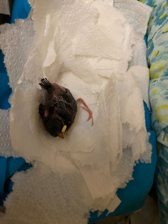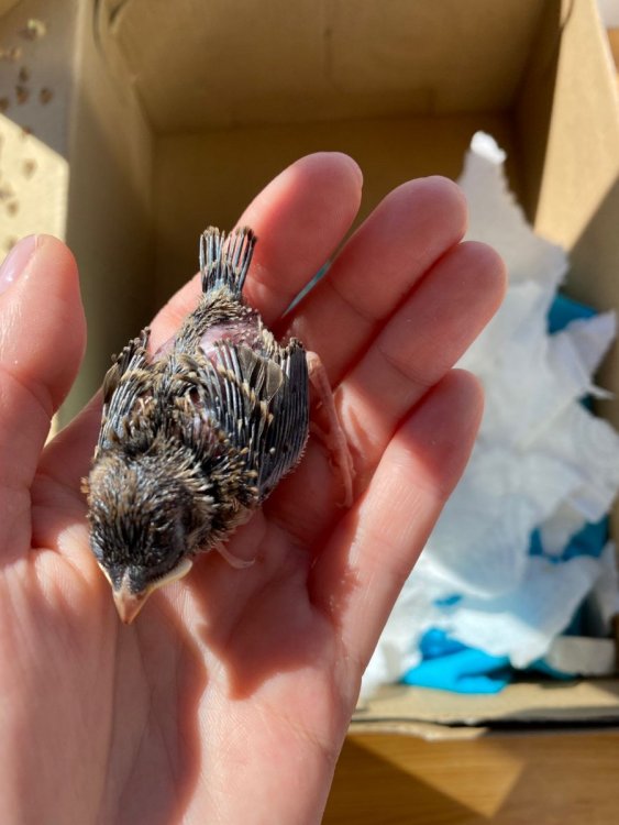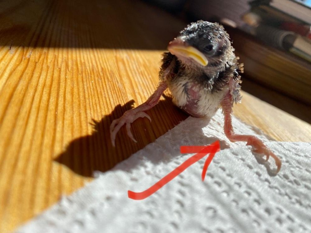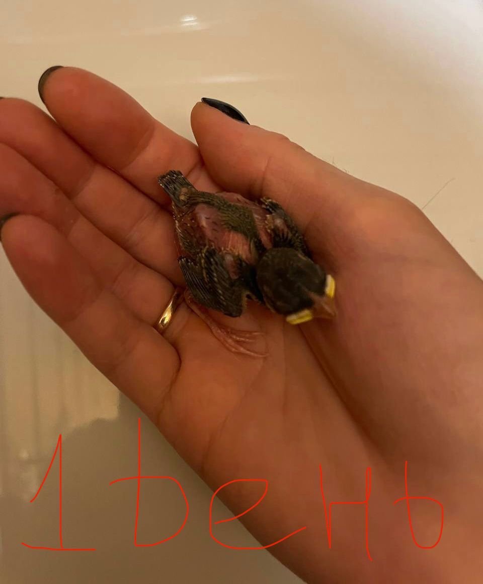 2. Здравствуйте! Живу в частном доме, в воскресенье с утра на асфальте нашла малыша. Был вялый, очень холодный, сколько пролежал неизвестно и чудом не был съеден кошками. Был лысенький почти, с трубочками на крыльях, хвостике. Под крышей гнездо воробьев, подсунуть его назад было невозможно. Птенец живет уже 4 дня. Активно кушает. Кормлю мороженными сверчками (основная еда), зоофобос по 2-3 червячка в день, мешанка 2-3 приема (яйцо, куриная грудка, пшено, творог обданный кипятком, перемолотая яичная скорлупа, гамарус сушеный измельченный, морковь стружка, не много зелени, кальция глюконат). Кушает раз в 30-40 минут с 5.30 утра до 23.00. Во время трех приемов пищи чуть обмакиваю еду в ветом (ветеринарный пробиотик), и один раз в молотый кальция глюконат (т.к. есть в мешанке). В каждый прием две капли воды из пипетки. Живет в коробке, тряпочками сделано подобие гнезда, застелено рваными салфетками. В коробке всегда горячая бутылка с водой (завернутая в ткань). За 4 дня прибавилось оперения, на фото видно. Птенчика вытаскиваю под солнышко на 20 минут в день, чуть прикрывая его, чтобы были не прямые лучи солнца. Есть две проблемы и один вопрос. Проблема первая: Птенчик какает с большим количеством воды, но не всегда. Вчера даже показалось, что помет пахнет (извиняюсь за подробности, почти как человеческий). Сегодня уже нет. Нет четкой капсулы, все прям жиденькое, фото прилагаю. Проблема вторая: Птенчик постоянно оттопыривает одну лапку и сидит заваленный на один бок. Что с этим делать? Возможно, травма от падения? Упал же на асфальт. Если берешь в руки, вроде лапки ровно, но все равно норовит завалиться. Если ползет, лапка движется, сгибается, но идет последней. Вопрос, нужно ли добавлять витамины в воду? Есть витамины попугая биофар, фото также прилагаю. Срок годности нормальный, храню в холодильнике. Вот правда совсем не помню, когда были открыты( Посоветуйте, как решить проблемы, очень хочется спасти малыша и вырастить здоровым.