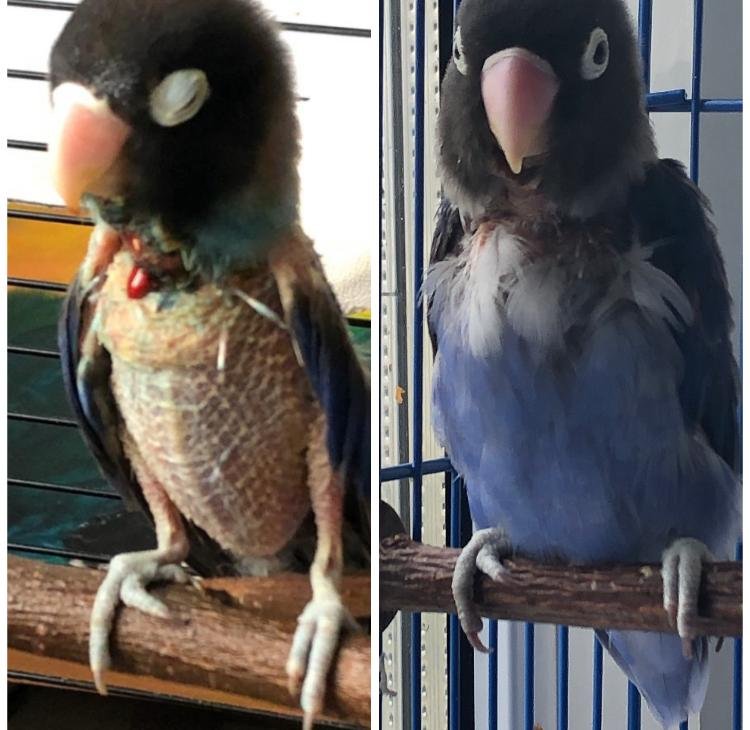 2. в декабре 2019 года неприрученный неразлучник девочка, живущий в в клетке с самцом,стал выщипывать из себя перья. Сначала мы думали, что это линька,что это нормально,тк это наш первый попугай и мы не особо в чем-то разбирались.Общипал грудь,ноги,под хвостом,самец помогал общипывать спину,на шее самка начала раздирать кожу. Мы решили написать на этот форум,посоветовали рентген,анализы крови и помета и зашивание раны,которая к тому времени была уже на всю шею.Отнесли помет в клинику,всё было отлично.При этом попугай с каждым днем всё больше вырывал из себя перья и разгрызал шею.Аппетит хороший,сам неразлучник активный,любил летать,не смотря на большие проблемы с оперением. Через какое-то время, когда поняли, что ему с каждым днем становиться хуже,стал сидеть на нижней ветке,мы записались на примем в "созвездие" к Волгиной Наталье Сергеевной. Она снова взяла помет на анализ,хоть я и принесла ей недавние отличные результаты. Она предположила, что у неразлучника цирковирус,вырвала несколько перышек на анализ,назначила лечение,рассказала, что цикровирцус-это неизлечимая болезнь,при которой можно только поддерживать здоровье птицы,но бывали и очень редкие случаи излечения. Я изучила информацию про цирковирус. Узнала,что при этом заболевании перья ВЫПАДАЮТ САМИ,ОСОБЕННО С ГОЛОВЫ,но у моей птички голова была полностью покрыта покровом, и перья не выпадали сами!она их выщипывала,так же при заболевании новые перья не растут,но у нее постоянно лезли новые перья,которые она сразу вырывала. Анализы были отрицательны.Врач сказал,что такое может быть,даже если птица больна,эту болезнь очень трудно выявить.Я конечно очень расстроилась,поверила врачу,давала лекарства.Ничего не помогало вообще.Записалась к другому врачу из "созвездия" Лешковой Марине Александровной,она сказала с уверенностью,что у птицы цирковирус,не смотря на то, что у птицы голова в оперении, и перья не выпадают сами. Она мне сказала, что птице осталось не больше полугода,состояние не улучшиться, она будет всю оставшуюся жизнь страдать,назначила еще больше лекарств. Я проплакала всю неделю, я не могла поверить ее словам.отсадила птиц в разные клетки на "карантин", что бы не заболела другая. Мой неразлучник был не прирученный, лекарства давать два раза в день в клюв. понимала,что для нее это еще больший стресс,что могу ухудшить её состояние. Не могла смириться, что у моей птицы такая страшная болезнь,даже не смотря на то,что ни один симптом не совпадает,было невозможно смотреть на нее без слез.Я очень верила в то,что она справиться.Прошла неделя,как птица живет отдельно,начала замечать,что за всю неделю она ни разу не разгрызла шею до крови,раньше это было каждый день. Через время увидела,что новых перьев стало очень много, птица вырывает уже не так часто.И вот спустя 4-5 месяцев рана полностью зажила и перьевой покров почти полностью восстановлен!!!!!?В итоге у моего неразлучника был обыкновенный дерматит,когда они жили вдвоем,самец её очень доставал,как оказалось,гонялся за ней, всё это я рассказывала врачам.и на фоне этого стресса она с собой такое сделала....Так что, первую очередь прислушивайтесь к себе,не всегда то,что говорит врач-правда.Если бы я послушала бы врача,что моя птичка безнадежна,что ей осталось пару месяцев,что не станет легче,может я и вовсе не отсадила бы птиц друг 