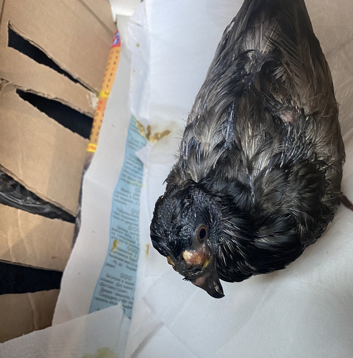 Неделю назад подобрала подростка голубя подранного каким-то хищником. Большой разрыв кожи в паху, точечные раны по телу, ободраны перья на спине. Неделю давала ципролет, нистатин, карсил - во избежание пастреллы. Рана - хлоргесидин, левомеколь. Истощение. Горло было чистое, наростов на шее не замечено. Сначала немного пробовал клевать просо, отваренное пшено. Помет плохой, конечно, списывала на антибиотик. К концу недели есть перестал. Из шприца не ест, вертится. Попробовала кормить отварной перловкой. Вчера вроде нормально получилось. Сегодня с утра попробовала засунуть перловку, что-то вызвало подозрение, заглянула в клюв и ужас! перловка вся застряла в горле, на дыхательном горле нарост, перекрывает его на 2/3, нарост плоский в районе хоан . Вытащила перловку из горла. Накормила жидкой кашей через катетер. Подключила орнидазол, нистатин заменила флуконазолом. В клюве мажу метрогилом. Ципро сегодня последний день (седьмой). С утра еще был помет в виде лужицы желто-белого цвета (может быть желтизна из-за карсила?). Сейчас, хуже всего - каша второго кормления похоже, не уходит из зоба и помета нет. Что делать? У меня не было опыта в остановке зоба. В принципе, жидкая каша должна уходить быстро. Птенец очень плох
