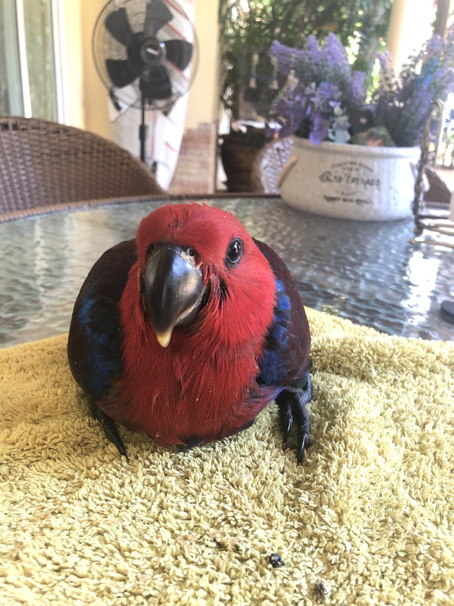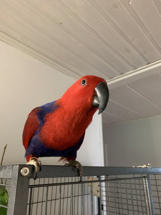 Года полтора назад отписывался я где-то на этом форуме на безптичьих правах, но обещал, что заведу-таки когда-то эклектуса. Ну и вот - моя Аска Пока ест по большей пророщенные зерновые. Как мне сказали, это основная пища, хотя читал, будто основа - фрукты. Но фрукты тоже даю. Пристрастилась к киви, ест виноград и яблоки. Купал. Из клетки выходит крайне неохотно и профилактически покусывает. Оставил в покое в клетке с открытой дверцей, чтобы начала выходить сама. В целом у меня живет около недели, чувствует себя получше, но еще довольно скованная. Забавно "укает", иногда так с ней разговариваем. Часто отвечает вопросительным "м?" XD Красивые они, конечно, эти эклектусы