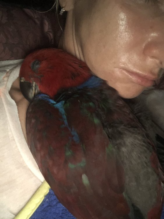 Добрый день, форумчане. Вашего полку прибыло - не смогли удержаться и всё-таки взяли 5 попугая- девочку Эклектуса. Теперь у меня три Хрю-Хрю Аратинги ( хрюнечка оптом) , Жакоша Чипуля , летучая Лисица и моя малышка . Спасибо огромное Марине ( заводчице) и ее мужу Евгению - сняли мою панику и поддержали меня в первые дни, так как с птичкой были некоторые сомнения . Мы ее взяли в магазине, самый большой в Паттайе , и вроде при питомнике, но бардак редкостный. Взяли на руки- я еле ее отдала продавцу, и спустя час вернулись и забрали ее домой. Прошло 5 дней, и только сегодня она начала открывать рот и есть смесь самостоятельно - прося и глотая. И яблоко вечером грызёт радостно . Второй день в обед ставлю кашки с папайей и мюслями - ковыряется , что-то жует . Утром на газоне сиганула к клеверу - я не дала, но отметила что она на 5 день стала бодрее и активнее . И сегодня начала идти в ладошки- стучу пальцами по столу и говорю иди , иди сюда маленькая- она ковыляет к рукам и пытается залезть на палец. Ну и очень активно второй день реагирует на голос мой- мне напоминает мяу мяу))) спит каждый вечер два часа на мне - тряпочкой распластавшись по груди и шее , что-то попискивая и похрюкивая во сне. Люблю ее просто нет сил, походе что на 5 день она начала приходить в себя и поняла что она дома и у неё есть семья))) и ещё хитрая морда поняла что ее в домик вернут на ночь- начала вчера уже протестовать . По итогу ей 2 месяца ( ну может чуть поменьше) весит она на сегодняшний день 420 грамм))) с именем пока смешно- спит- Тыковка, на муже спит- он ее поросёнок Фунтик назыаает( Фунтя) , не удивлюсь если приживется другое имя)))) у меня аратинги с именами были, а по итогу на слово Хрюнечки и хрю- хрю они в неописуемом восторге скачут у меня по голове))) только Жако при звуке своего имени всегда отзывается и говорит что « Чипуля Кукусик, Любимый мальчик»? вот такая история)
