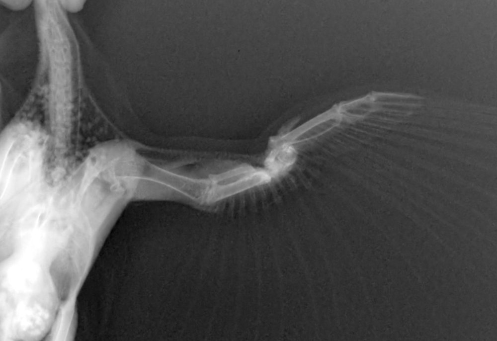 3. Добрый вечер! В выходные подобрала голубя, не летал, крыло висело. На внутренней стороне крыла гематома и отёк. Ран нет. Аппетит отличный, помёт в норме, присутствует умеренное истощение. Сегодня удалось сделать рентген, перелом лучевой кости со смещением. Я так понимаю нужно ставить спицу. Подскажите у кого то может были подобные травмы, есть ли шанс вновь полететь после операции?