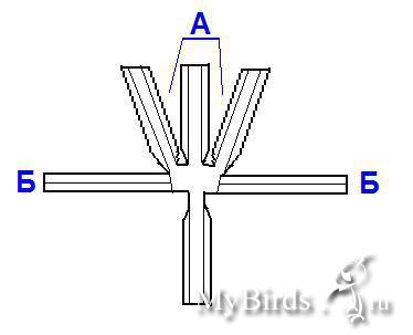 Cheshirski Опубликовано 28 января, 2013 #6 Опубликовано 28 января, 2013 частью лапки, которая выше кисти ( не знаю, как это анатомически назвать, простите). Это цевка. Факел-Нимфа, я опишу способ фиксации, который сам применял синице с переломом цевки как раз над пальцами. Сработало на сто, лапка даже ровненько срослась.В общем, опишу, а вы смотрите - сможете повторить, или нет. Ювелирно, ибо лапка маленькая.Итак, для начала вырезаете из тонкого картона или альбомной бумаги примерно такую развертку: Как очевидно, тут как раз на 4 пальца. По тонким линиям - сгибы. Угол "А" выбираете так, чтобы пальцы были расположены естественно, но не вплотную друг к другу. Части "Б" отгибаются кверху и сгибаются пополам, их длина - почти до сустава выше цевки. Длина полочек под пальцы - примерно 1/3 длины пальца. Торцы полочек под пальцы и частей "Б" надо чуть-чуть помять - чтобы не было острого бумажного края.Берем пластырь или бумажный малярный скотч, режем из него полоски шириной примерно по 4 мм, длиной до 1 см. Минимум их понадобится 6, но нарежьте с запасом - чтоб потом, если неудачно приклеится, или на пол упадет, не резать в спешном порядке.Сгибаем все, и снизу надеваем на лапу. Пальцы должны быть обхвачены снизу и далее сбоку-сверху, цевка - по бокам. Образуются как бы трубочки, в которые будут помещены пальцы и цевка.Обклеиваем каждую трубочку пластырем. Она должна обхватывать пальцы плотно, но без фанатизма - пальцы и цевка не должны там болтаться, но и пережимать не надо. Первым делом клеим полоску вокруг цевки, чуть выше пальцевого сустава - это сразу не даст конструкции сваливаться с лапки. Далее - средний палец, потом задний, потом боковые. Заканчиваем кольцом вверху цевки, чуть ниже края частей "Б". Если между нижним и верхним кольцами на цевке будет слишком большое расстояние (больше 4-5 мм), то можно положить еще одно кольцо пластыря, можно и внахлест на верхнее/нижнее.При наклеивании, конечно, следим, чтобы лапу не перекашивало, и ее положение оставалось естественным. Такая конструкция не даст стопе выворачиваться и травмироваться дополнительно. Носим такой лубок пару недель. Сидеть птице будет не особо удобно, но лапа заживет куда быстрее и лучше. update. Ах, да, у вас кольцо на лапе.Если возможно - части "Б" просоввываем под кольцо, если нет - то обрезаем примерно до уровня поднятого вверх максимально кольца.