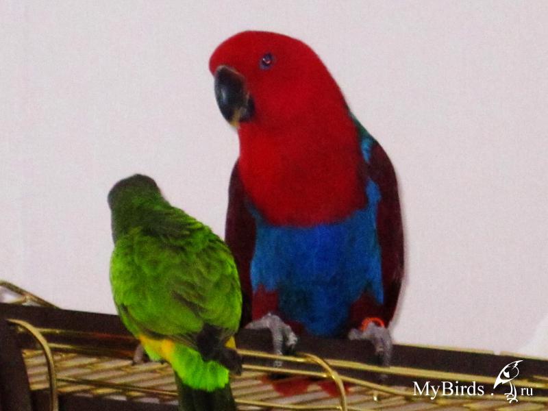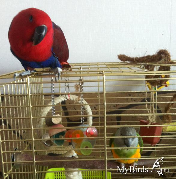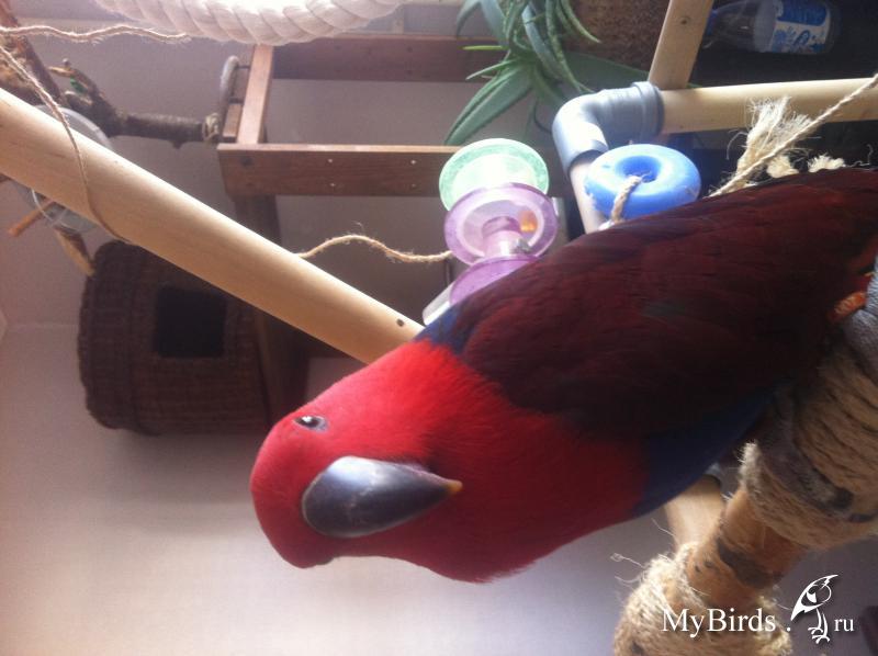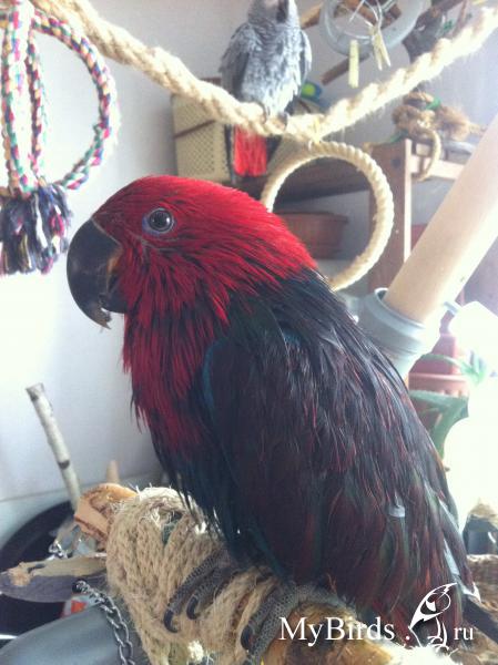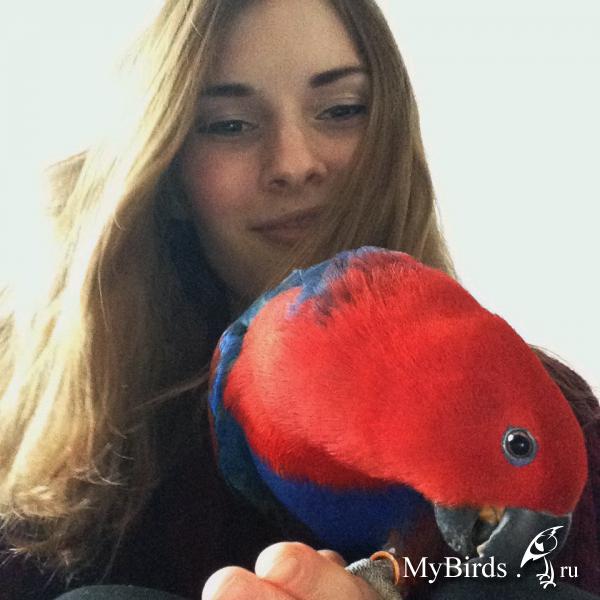fanka Опубликовано 29 марта, 2013 #1 Опубликовано 29 марта, 2013 (изменено) Хочу познакомить вас со своими замечательными девочками эклектусом Малиной, приехавшей к нам из волшебного леса от необыкновенных людей, и жакошей Марусей, прибывшей от туда же, правда Маруся не является ребенком семьи Шенцовых, она у них приемный птень! Поскольку рассказчик из меня никакой, вторую темку в разделе жако заводить не буду, а в этой расскажу про всех своих любмицев. Итак о Малине. Малинка-Маришка (так у меня как-то сорвалось с языка, ну и прицепилось к девочке!) необыкновенный чудо-ребенок! Приехала к нам уже достаточно давно, еще в августе прошлого года. Поскольку у Малинки характер не совсем эклектусосамочный, привыкание друг к другу у нас происходило не прям вот быстро-быстро, а постепенно. Самки эклектусов по рассказам Марины – первой мамы Малинки, вобщем то боевые красавицы, как она выражается «в горящую избу влетят, коня на скоку остановят», у нас же совсем другой вариант. Скорее на такую мадам смахивает Маруська, та шухер, а не птица, а Малинка очень скромная и трепетная девочка. Поэтому по началу я очень боялась переборщить с вниманием по отношению к ней. Как бы общалась с ней на расстоянии, постепенно это расстояние уменьшала и, наконец, свела на нет. Малинка очень долго присматривалась ко всем нам, и всё думала, думала. Что уж она прокручивала в своей головке? Муж мой даже сыну говорил «учись думать у птицы!» Она вообще такая у нас умница!!! Даже прежде чем нахулиганить, сначала всё хорошенько обдумывает. Говорить начала очень быстро. Ну здесь надо сказать спасибо Маруське. Она у нас болтушка-говорушка страшная. Вот Малина и стала повторять все за ней. Правда по началу картавила, какие-то звуки проглатывала, шепелявила, но с каждым разом у нее получалось всё лучше. Теперь девочки наши могут вести диалог, особенно по утрам любят поболтать. Причем Малинка говорит настолько чисто, что не всегда отличишь, кто из них болтает, а порой мои мужчины не различают, кто их зовет я или птички мои! Маруська мне очень помогла в приручении Малины! Малинка всё повторяет за Маруськой. Клетки стоят рядом, поэтому девочкам очень хорошо видно друг друга. По началу даже игрушки приходилось вешать им одинаковые, чтобы Малинка могла играть в такую же игрушку, как и Маруська. А когда я гладила Маруську, Малинка тоже преодолевала страх (она изначально была ручная, но мы для нее были не знакомые и страшные, поэтому доверие Малины надо было завоевывать) и подходила общаться сама! Сейчас уже Малинка практически полностью доверилась нам, но пока только нам, к незнакомым относится с большой осторожностью. Начали с ней, как я говорю, заниматься уроками, т.е. разучивать команды. Первая команда, которую мы выучили, была «на ручки». И до того хорошо она ее выучила, что теперь руку в клетку сунуть стало невозможно, сразу на ручки! Так же хорошо знает «нельзя», «поцелуйчик», «домой», это для нее команда не любимая, хотя клетку свою обожает, когда совсем не хочет домой, может даже укусить, и мне приходится терпеть укусы, но на своем настаивать. Так же даем лапку, лезем на качельки качаться, опять таки по команде! Обучается Малина достаточно легко, а главное с большим интересом и удовольствием! Вообще с появление в нашей семье Малины, мы все просто влюбились в эклектусов! До чего же сказочные создания!!! 