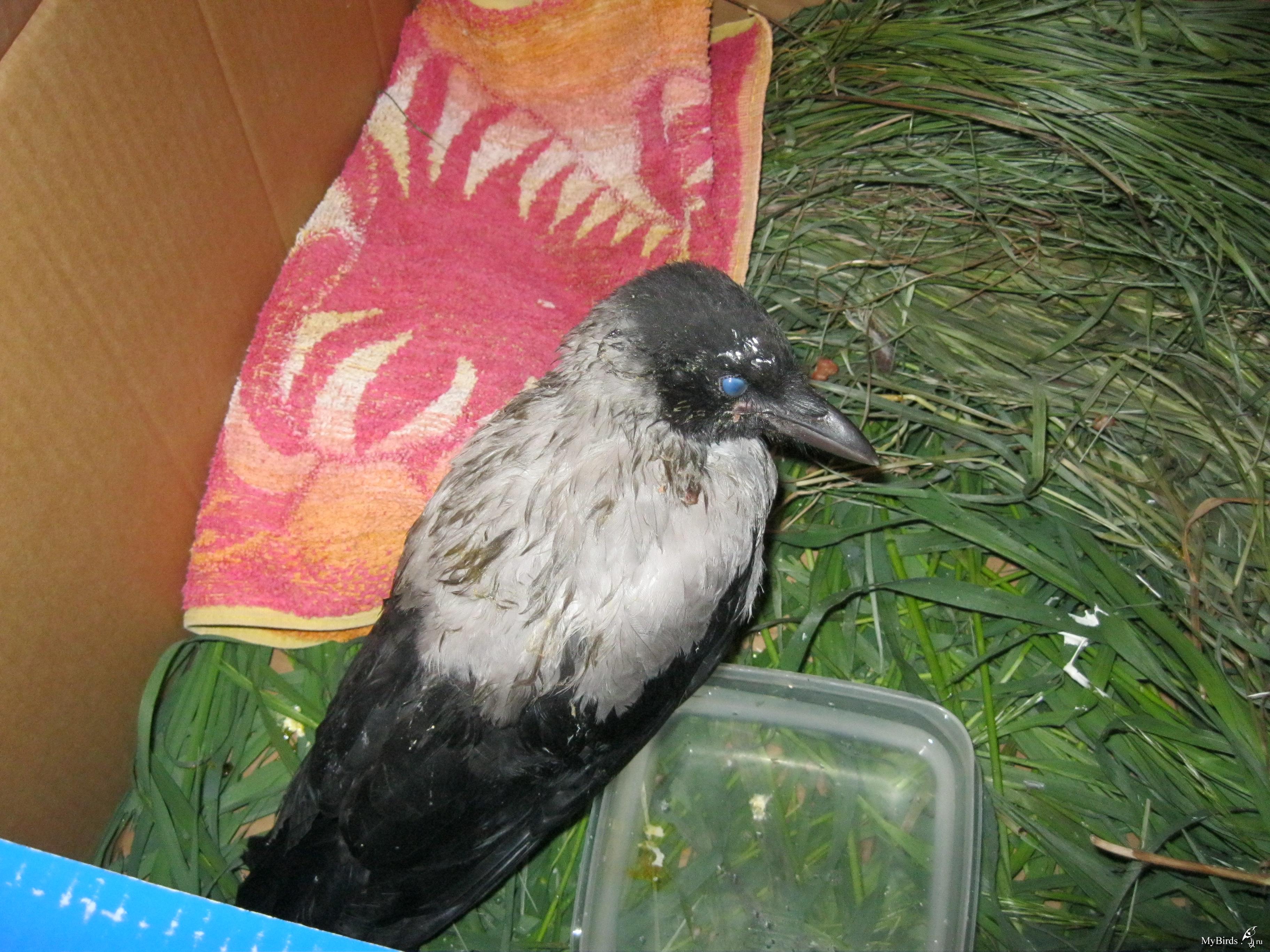 Никогда не ходили в парк гулять, а тут понесло нас с дочкой. А в парке гнездятся грачи и галки. Ну и увидели мы в траве птенчика барахтающегося, на крылышки опирающегося. Я обычно слётков с земли поднимаю, на веточки повыше пристраиваю. А тут поднимаю и вижу-лапка одна в крови, висит неестественно, посмотрела-перелом прям над скакательным суставом. Жалко стало птенчика, принесли домой, шину наложили, рану обработали, ещё одну рану на спинке зашили. Клещиков-блошек вытравили.