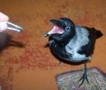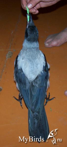 ai_u Опубликовано 2 июня, 2013 #1 Опубликовано 2 июня, 2013 Здравствуйте. Тему про то, почему нельзя подбирать слётков, прочитала несколько лет назад и проинформировала "спасателей-любителей" из своего окружения, так как приносят они всё собранное в первую очередь мне. Увы, этого оказалось недостаточно... В данный момент у меня на руках оказался воронёнок. Почитав форум, решила создать свою тему, так как, во-первых, из-за постоянных повторений прочитать все близкие темы затруднительно, а во-вторых, каждая ситуация в чём-то уникальна и порождает свои вопросы. К птицам в доме отношусь отрицательно, но, "сваливаясь" на мою голову, они об этом не подозревают. Птиц с большой долей вероятности останется у меня, если в ближайшие дни не найдётся желающий его взять (новосибирцы, ау!). Вернуть его невозможно, так как подобран он был вдали от города в труднодоступном месте, причём, по утверждениям подобравшего, за два часа возле птенца не появилось ни одной взрослой птицы. Фото сделаю в ближайшие дни, пока словесное описание. Птиц уже оперившийся, по словам подобравшего, мог перепархивать на метр, но в оперении и особенно на голове ещё заметны следы пуха. С него осыпаются чешуйки (не знаю, как точнее) перьевых трубок. Хвостовое оперение несколько побитое, но в целом состояние пера удовлетворительное. Внешних повреждений (ран, переломов) не первый взгляд нет, лапы и клюв блестящие, не видно даже внешних паразитов (по подстреленной горе-охотниками сове, к примеру, они бегали толпами). Детальный осмотр и фотографирование отложила на завтра - птиц перенёс долгую трудную дорогу. Но ест хорошо - мотыля попробовал с некторым подозрением, но ел, охотно ел куриную грудку, огурец, яблоко, а вот живого мраморного таракана выплюнул. Сам есть не пытается, принимая еду в разинутый клюв. Жадно пил вливаемую воду. Прошу консультации форумчан по следующим вопросам:1) Примерный возраст птицы. Не рановато ли данный птен покинул гнездо?2) Нормально ли то, что птенец почти не опирается на лапы, лежит либо приподнимает тело "на пятках", опираясь на стопу и голень. 3) По рассказу "подбирателя", птица мёрзла, пытаясь забраться под куртку, и несколько успокаивалась, угревшись на руке. Ночевать птена оставила на решётке террариума над включенной лампой, дав для удобства сложенную плоским валиком старую льняную простыню (и не жёстко, и форму держит). Сперва птиц упорно переползал на голую решётку, задремав, опускал голову и вытягивал вдоль отражателя лампы клюв, сейчас сидит на валике, опираясь на стену, засунув клюв под крыло. Высота над полом 40 см, рискнула оставить на сегодня птица так, тем более что спать мне не светит, а птиц находится в поле зрения. Нормальна ли такая мерзлявость, учитывая, что температура в квартире ~ 22 градуса, а на улице температура уже несколько недель держится на уровне 10-15 градусов?4) Как лучше обустроить птенцу временное пристанище до "вылета из гнезда"? Горе-спасатель весь вечер пытался замерзающего, по его мнению, птица чем-то укрыть, но получал от меня по рукам и минут на двадцать успокаивался. Действительно ли птен мёрзнет (он сейчас дремлет вдали от лампы) и нужен ли ему дополнительный обогрев?5) На сайте я нашла информацию, чем кормить, но как часто надо кормить слётка и взрослую ворону? Кстати, рацион был указан для ворона, и утчнялось, что у ворона, как у самого "мясое