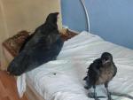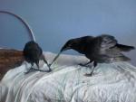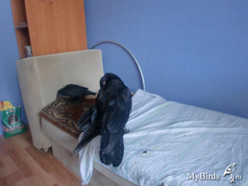Корвиана Опубликовано 14 июня, 2013 Автор #141 Опубликовано 14 июня, 2013 (изменено) У Голя теперь под столом новое место. Не знаю, стоит ли его выпускать, он забьется в угол, боится всего... Может когда освоится еще получше, тогда можно будет выпускать походить по дому. Или по балкону, уходя в это время с Дарком на прогулку) Отличная мысль же. Птицы у меня знакомились крайне аккуратно и под строжайшим присмотром. Даркуша трогает грачика так же, как и мои пальцы, нежно-нежно)Друг на друга рты открывали, вроде бы просили есть друг у друга. И рассматривали друг друга. А позже стали заниматься своими делами, ноль внимания друг на друга.Вот бы получилось сделать их друзьями... Чтоб ворон знал, что грача нельзя обижать. Но вряд ли такое реально, повзрослеют и ворон все равно уже не будет таким безобидным Хотя я и читала про дружбу вороны и ворона...У Птицелова ворон не трогал клетки с певчими птицами. Как же он его научил такому? Только вот мне не нравится, если вороша делает так: Приходится предотвращать Изменено 14 июня, 2013 пользователем Корвиана