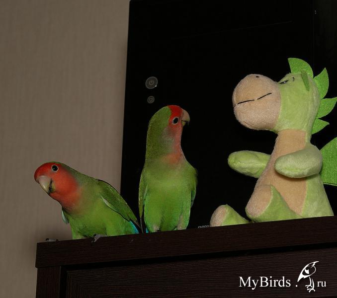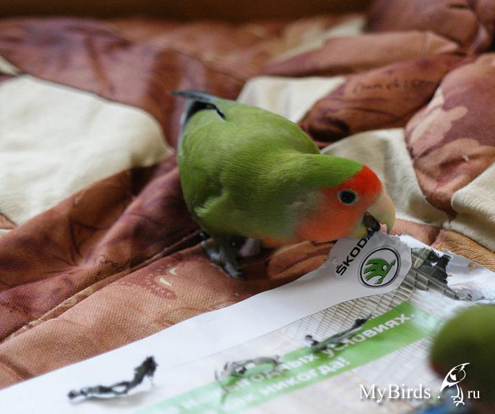 Bamboo Опубликовано 26 июля, 2013 Автор #24 Опубликовано 26 июля, 2013 Грабли №4. Кто ты, птичка?О! Об определении пола и возраста неразлучников слагаются легенды. Этой теме посвящена отдельная ветка форума. В процессе подбора пары у хозяев появляется целая стая из «неудачных» вариантов, которым тоже нужна пара... Мне кажется, что эти птички сами не знают, кто же они на самом деле. Отсюда все поведенческие аномалии. Есть такой анекдот: Как делают корабли в бутылках? В бутылку засыпают силикатного клея, всякого мусора и трясут. Получаются разные странные штуки, иногда корабли.Вот так и с неразлушами. Берется клетка, селятся птички... иногда получаются пары. Радя и Тори – классическая пара. Что по окрасу, что по непонятности поведения.Они всегда всё делают вместе. Самая большая дистанция, на которую отдаляются друг от друга – полметра. С утра могут начать стрекотать, чесать за ухом и вытанцовывать друг перед другом. Потом Радя кормит Тори завтраком, потом Тори кормит Радю, и так по кругу. Можно особо не переживать, что кто-то что-то не равноценно получает из еды – все равно в итоге все будет перемешано При этом мастерски стригут бумажные полоски и засовывают их в хвост.Вот: У кого-то половозрелые птичи полируют жердочки, у кого-то мягкие игрушки. Мне повезло гораздо меньше – объект страсти (обоих) моя несчастная голова Мужнина шевелюра их почему-то не прельщает. Что делать с этими извращенцами, пока не придумали Купили недавно плюшевого попугая (а вдруг прокатит?), пока панически его боятся.Единственное, чего не видела – чтобы кто-то раскидывал крылья, как самочка, которая готова к спариванию. В общем, больше похоже на мальчиковое поведение. Но полоски в хвосте «портят» всю картину 1