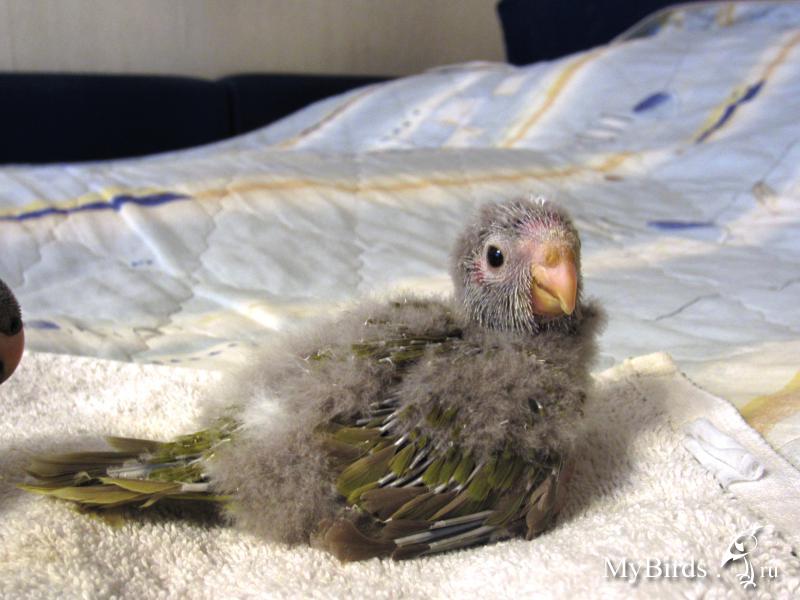 Julasha Опубликовано 1 октября, 2013 #1 Опубликовано 1 октября, 2013 У нас прибавление . Чико и Холли вывели двух птенчиков: Агат, самец, родился 12 августаАгнесса, самочка, родилась 16 августа.Долго не писала об этом, было волнительно, что все закончится неудачей... первый выводок, молодая мамочка... Получилось так, что Холли, едва сойдясь с Чико после гибели Дори, практически сразу начала нестись. Ее не остановил ни 10-часовой световой день, ни еще более сокращенный... курица упорно несла яйца в поддон. Причем не наблюдалось какого-то слишком частого топтания... просто она решила, что раз она достигла своей цели, добилась Чико, теперь, чтобы доказать свою состоятельность как супруги, надо нестись . Взвесив все за и против, решили поставить ей гнездо и дать отсидеть для успокоения. Удачно совпало, что птицам только что были сделаны анализы, которые оказались хорошими. И буквально перед началом кладки им был проведен курс кальция и витаминов (хотя я уже потом, задним умом поняла, что возможно, именно витамины спровоцировали птиц на размножение).Соображением против было то, что Холли на этот момент еще не было года, так что рановато ей было заводить деток. Но, как мне объяснил опытный заводчик, нагрузка на организм самки в период гнездования заключается в снесении яиц, а не в процессе насиживания, а она и так уже неслась. Забирая яйца, я стимулировала ее на снесение следующих, ей же необходимо было восполнить их количество... так самка начинает нестись безостановочно и количество яиц доходит до 20 и больше... если же дать ей сделать кладку и отсидеть, то яиц будет меньше. Так и произошло, Холли снесла 7 яичек, которые мы сложили в домик, она села на них и успокоилась. Риск раннего гнездования заключается в опасности потерять потомство, поскольку молодая самочка с несформировавшимся гнездовым инстинктом может не захотеть кормить птенцов... Словом, мы оставили ей два живых яичка, а остальные я окунала в кипяток. Подумали, что для первого раза двух птенят им будет вполне достаточно, чтобы пара почувствовала себя родителями и научилась управляться с детьми. Ну, и на всякий случай я купила банку Нутриберда... И плакал мой летний отпуск, муж с ребенком отправились на море в одиночестве, а я нянчилась с малышами, потому что птиц на гнезде никому не могла доверить .... Ну вот, с разницей в 4 дня пара вывела двух птенчиков... темно-серопухого большеголового карапуза и второго - посветлее, с тоненькой шейкой и крохотной головкой . Вопреки опасениям, Холли хорошо кормила деток, а когда младшему было 10 дней, их кормление взял на себя Чико. Вот какие мы были маленькие, но шилопопые и настырные:Агат и Агнесса, 12 и 8 дней: Когда детки подросли и стали потихоньку оперяться, оказалось, что у Чико с Холли получился зеленый мальчик, общительный, любопытный и бесстрашный, которого мы назвали Агатом, и маленькая оливковая девочка, нежная и кроткая, как овечка - Агнесса ("агница", "овечка").Вот тут малышам почти месяц:
