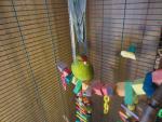 Julasha Опубликовано 2 октября, 2013 Автор #4 Опубликовано 2 октября, 2013 И вот на 40-й день от рождения свершилось знаменательное событие - Агатик впервые вылез из дуплянки . Вот его любопытная мордашка высовывается из летка: (прошу прощения, качество фото, конечно, никакое, против света приходилось снимать, там как-раз висит птичья лампа Да и вообще хорошие фото - не моя стезя, как я с грустью убедилась.. наверное, руки не оттуда растут ).Кстати, стоит сказать пару слов о дуплянке. Гнездовой домик нам сделали на заказ в Питере, большой и просторный, с запасной перегородкой на случай большого выводка. В первые же дни я, как советуют, включила увлажнитель и положила на крышку домика мокрое полотенце. Однако через некоторое время от полотенца пришлось отказаться, потому что на крышке домика и стенках наверху начала расти плесень Пришлось снимать ее и высушивать домик, прижигая раскаленным утюгом... Словом, полотенце я убрала, но увлажнитель рядом с домиком работал круглые сутки, и через два месяца непрерывной работы он не выдержал и сломался, так что пришлось покупать новый . Но главное, что птенчики были здоровы... Вскоре Агнессе стало без Агата в дуплянке скучно и она поспешила вслед за братом. Причем обоих птенцов сразу потянуло на самый верх вольера, они залезли на верхнюю жердочку и сидели там довольные и гордые собой:Первые неловкие шаги по клетке: Папа Чико кормит доцю: