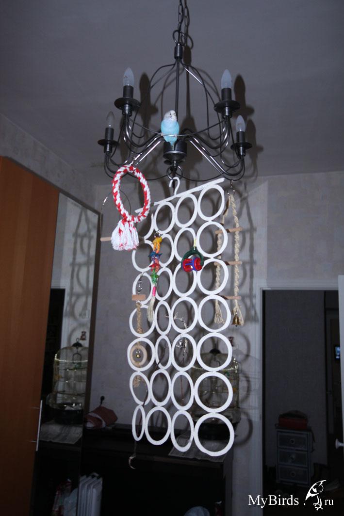 Стеша Опубликовано 30 июня, 2008 #556 Опубликовано 30 июня, 2008 Друзья! Хочу поделиться с вами нашей игровой территорией, а также самой идеей. Ни площадкой, ни стендом это не назовешь, но тем не менее простора для птицы полно. Как-то случайно в магазине IKEA мы увидели вот такую вешалку для шкафа, состоящую из множества колец, и решили переделать её в "рай" для питомца. Очень удобно - множество дырочек, куда крепятся колокольчики, веточки и прочие аксессуары и игрушки; главное, чтобы то, к чему вы её вешаете, было достаточно крепким, хотя вешалка сама по себе не очень тяжелая - всё зависит от того, сколько на неё навешать добра. В нашем случае мы повесили это всё на люстру, которая сама по себе тоже для птички является продолжением игровой площадки )))Желаю вам новых идей и радости вашим птичкам!