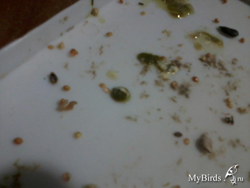Юкла Опубликовано 1 ноября, 2013 Автор #43 Опубликовано 1 ноября, 2013 (изменено) Утром насыпала энтерол и карсил на увлажненную смесь, Кирилл тут же отправился завтракать, ему ооочень понравился вкус, присвистывал, прикрывал глазки. Из-за утренней дачи лекарств пришлось пожертвовать режимом, теперь он такой в будни: минут 40 седьмого утра включаю свет, все птицы просыпаются и идут есть, минут через 20 свет выключаю и ухожу на работу, птицы спят до естественного посветления в комнате ( в районе 9-10), ну и отбой в половине девятого вечера.Вечернюю кашу Кирилл (и волнисты тоже) не оценил, поел меньше ожидаемого, я там переборщила с перловкой и рисом, уменьшив гречу, а они ее любят, видимо, сильнее. Но так как лекарства были сверху, надеюсь, что все они в него попали-таки. Птиц в хорошем настроении, даже соблаговолил немного пролететь (он умеет летать, но больше пешеход и скалолаз).Вот помет:На фото помет имеет коричневатый оттенок, в реальности это не так, он болотного, грязно-зеленого цвета."Червячок" помета не желеобразный. Изменено 1 ноября, 2013 пользователем Юкла