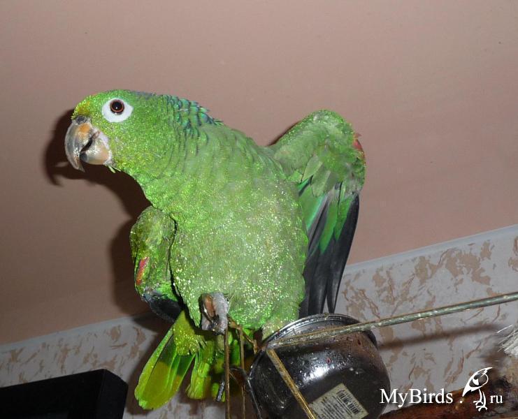 Такая сейчас и перья продолжают расти (на фото в капельках воды после купания)! Птица начала летать и больше не щипается!