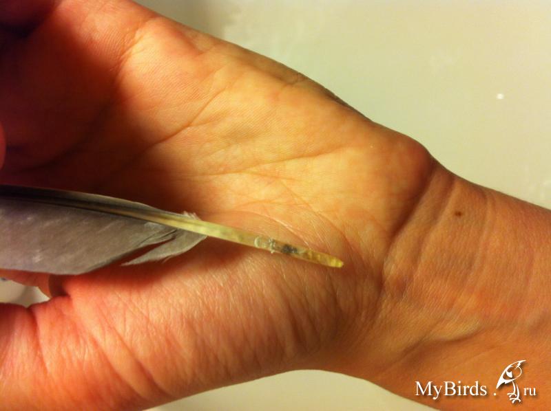 Marina_F Опубликовано 22 ноября, 2013 #1 Опубликовано 22 ноября, 2013 Здравствуйте! Помогите пожалуйста понять, что с попугайчиком.По схеме:Корелла нимфа, уже второй месяц, купили в магазине в Германии и регулярными двухнедельными контролями, окольцованМальчик, возраст 7-8 месяцевУсловия содержания:просторная клетка100х100х60, дополнительный свет, влажность ?, температура 18-20СС аппетитом ест корм Dehner Zoo Gro?sittich-Futter, витамины Dehner Zoo Mauserhilfe, также ест сенегальское просо(больше ничего не ест), последние две недели пьем витамины в поилочкуПомет без особенностей, когда купили сразу начал линять, появилось много "палочек"-перьев на теле голове и в области маловых перьев. Сейчас кажется, что процесс активной линьки прекратился, хотя в хохолке еще много коротеньких растущих перьев, но такого количества палочек уже нет...Меня очень беспокоит(я думала, что после линьки это пройдет, что у него циркулярно полосой где-то в 1,5-2 см голая шея. Когда мы его купили, то думали, что его пощипали, потому что и хвост какой-то подраный боевой был, а теперь мне кажется, что там так же все и остается... Может пух немного появился, но перьев нет в норм. состоянии этого не видно, кажется, что просто худенькая шейка, но когда он чистится и голову поворачивает, то видно. Самое главное, что сегодня у него в полете выпало вот такое перо(фото) Что это может быть? За всю его линьку маховые перья не в большом количестве выпадали, но все что были, были по виду нормальные. Еще один раз, когда он по первости метался по клетке, одно маховое перо сломалось у основания. Как Вы думаете стоит беспокоиться о пероедах или очиннике?По поводу поведения- он очень апатичный, не могу понять, он до сих пор нас так боится или он действительно апатичный??? Когда мы ему даем чумизу идет и с энтузиазмом ест, когда ему не нравится, что мы подходим -кричит и возмущается сразу, чистится регулярно и активно... В остальное время сидит и смотрит в одну точку, ничем не интересуется, в игрушки не играет, на руки идет только за чумизой, съест и сразу уходит Так он выглядит