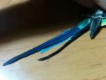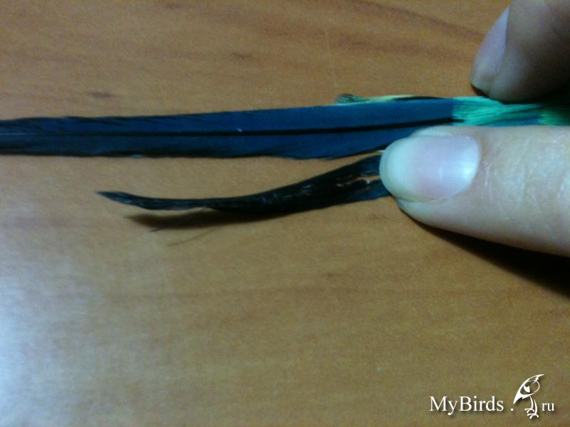 В этом месяце появилось одно странное (будто погрызанное, раздробленно-склеенное) перо в хвостовом оперении. До этого подобных перьев не вырастало.
