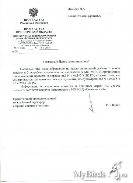 iva-denis Опубликовано 24 января, 2014 #9 Опубликовано 24 января, 2014 Отправил сегодня по электронке заявление в природоохранную прокуратуру, посмотрим как там работают ребята! Присоединяйтесь, чем больше будет заявлений на данного гражданина тем лучше "задумаются"правоохранительные органы, желательно, чтобы кто нибудь сделал акцент на "этическую" сторону размещенного варварства в соц.сетях. Для шаблона вот что я отправилУважаемый Роман Владимирович!Я Иванов Денис Александрович, 23.01.2014 г. на сайте www.odnoklassniki.ru, на персональной странице гражданина Александра Романцова (http://www.odnoklassniki.ru/romancov), проживающего в Оренбургской области, г. Сорочинск, обнаружил фотоматериалы с циничными комментариями, свидетельствующие о добыче с применением огнестрельного охотничьего оружия данным гражданином, одной особи сапсана занесенного в Красную книгу РФ, отнесенного к особо ценным видам (Федеральный закон от 2 июля 2013 года №150-ФЗ «О внесении изменений в отдельные законодательные акты Российской Федерации», Постановление от 31 октября 2013 года № 978, документ опубликован: 3 ноября 2013 09:00). Ущерб за одну добытую особь сапсана составляет 600 тысяч рублей (Приказ Министерства природных ресурсов и экологии Российской Федерации от 12 декабря 2012 г. N 429 г. Москва). Также на персональной странице гражданина Александра Романцова размещены фотографии, где он позирует с добытыми двумя особями ястреба-тетеревятника. На основании выше изложенного, прошу Вас принять соответствующие меры в отношении гражданина Александра Романцова по ст. 258.1 УК РФ за добычу одной особи сапсана и по статье 7.11 КоАП РФ за добычу двух особей ястреба-тетеревятника.Также отправляю скриншоты (4 фото) с его персональной страницы с добытыми птицами.
