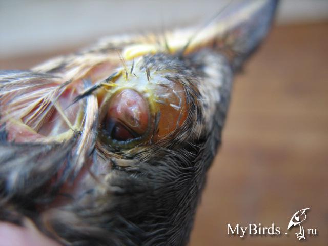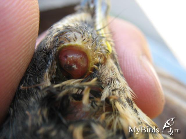Вскрыл вчера- в правом-если смотреть сверху на головку птицы (который второй отснят) глазу явно что-то типа разрастания тканей(грануляции?)- в левом- мешок с жидкостью. ввёл диоксидин в эти образования. Птица сегодня намного больше щебечет- видимо с теми, кто за окном переговаривается.