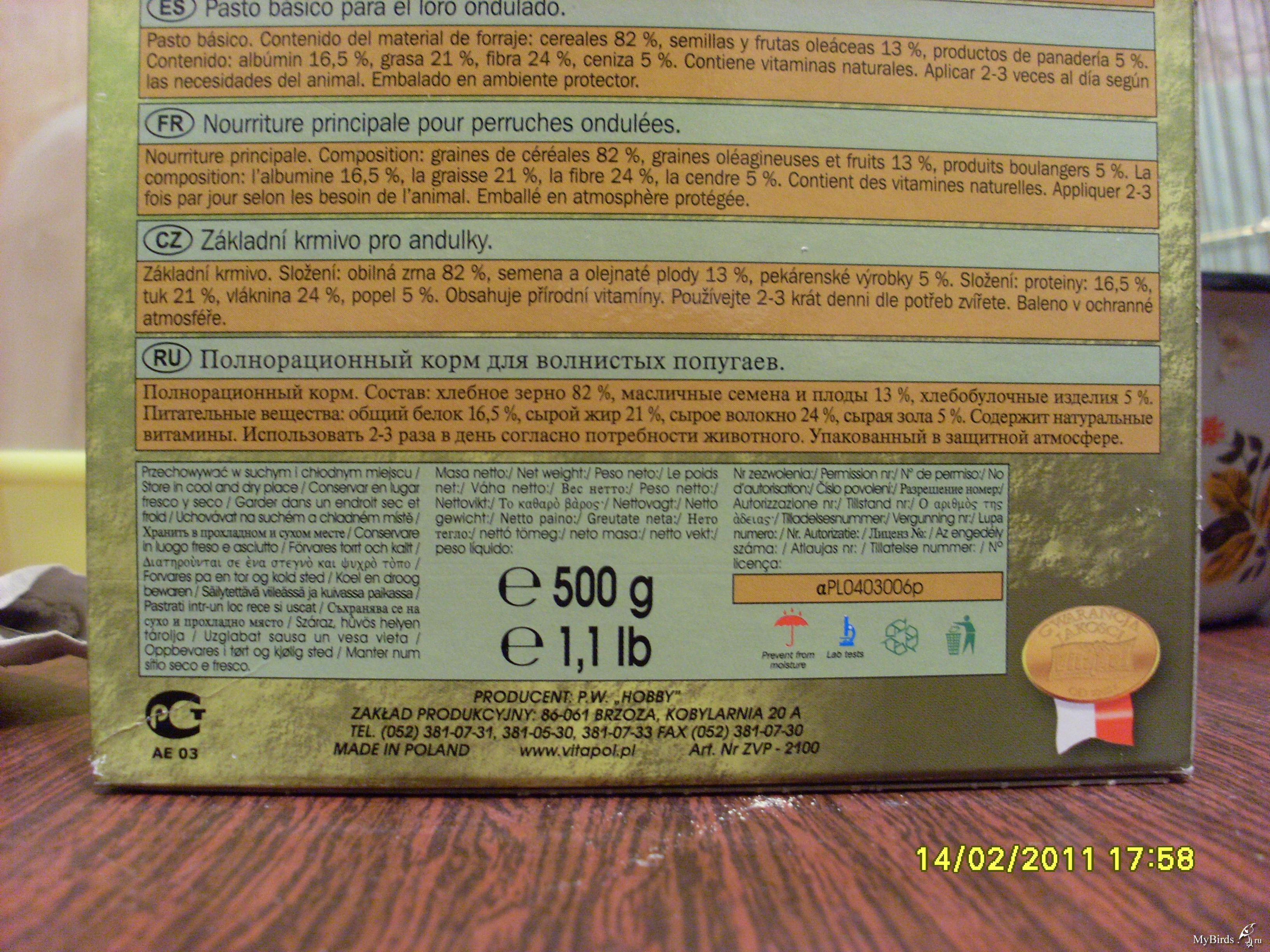 Лунный Кролик Опубликовано 14 февраля, 2011 #36 Опубликовано 14 февраля, 2011 Мнения тут разные, смотрю...Купила я этот Витапол (появился вдруг у нас). Состав какой то странный. Не скажу, что много семечек, но корм то для волнистиков!!! Еще попадаются мелкие орешки, на вкус как кешью. Так то корм чистенький, никто из пакета не выполз и не вылетел. Пахнет приятно. Не сказала бы, что уж очень много этой хлебной крошки. Но вообще состав бедноват. Птичкам пока не давала.Жду Ваше мнение.На последней фото - слева РИО для волнистиков для сравнения.