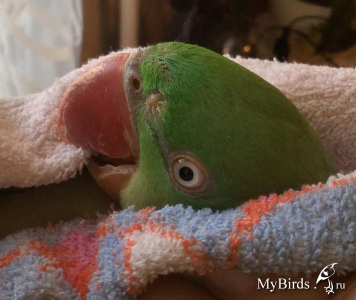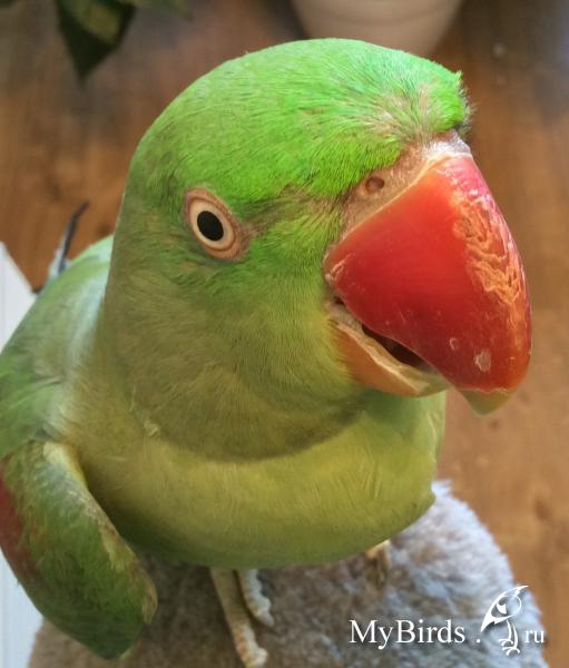 Irinkaa Опубликовано 9 октября, 2014 #3 Опубликовано 9 октября, 2014 Пару недель назад, на Одесском Староконном рынке приобрела я попугая. Красивый, взрослый, Александрийский....вроде как самец. Продавец сказал, что форма головы плоская, как у самца, тазовые кости соединены (у самок вроде как раздельно), ещё сказал, что ему два года и что бывшие хозяева уехали, и поэтому вот отдали на продажу. Попугай очень милый, ручной, даже пытается говорить уже. Форма головы, тазовые кости - всё это очень относительно для определения пола попугая. Сейчас в линьку смотрите проявится ожерелье или нет, будет ясен пол попугая. Если не хотите ждать и есть желание узнать пол попугая, можете отправить перья на анализ пола в определённые лаборатории Европы. Визуально попугай подходит под 2 года, это есть. То, что попугай ручной и начинает говорить, это очень хорошо, а при хороших и правильных условиях содержания и питания, заботы и любви он вообще расцветёт, будет очень хорошим попугаем-компаньоном.Я сразу при покупке обратила внимание на то, что у него клюв плохо выглядит. Но как мне объяснили, что кончик ободран, так как попугай точит клюв об камень. А сверху расслоение из-за того что он по клетке лазит и вроде как обдирает клюв о прутья. Вот прошло две недели и клюв стал выглядеть хуже, в интернете почитала, что нужно давать Цамакс для попугаев или добавлять немного серы в рацион. Цамакс я не нашла, поэтому купила специальную серу и начала по инструкции добавлять в воду. Но что-то мне эта идея как-то не нравится (интуитивно). Клюв действительно в не очень хорошем состоянии, есть такое, тому много причин - это в первую очередь недостаток витамина А и кальция, и то, что попугай чесанием клюва облегчает себе дискомфортное состояние, возможно даже болезненные ощущения.Сера в воду не подходит. Её нужно сыпать на влажный корм (замоченное зерно, каши, пюре, на кусочек яблочка, например, и давать сразу съедать), размер дозировки - с фасолину.Для улучшения состояния клюва в качестве профилактики, можно сделать упор на продукты, содержащие витамины А, С, В9, РР, Н, кальций.Например, включить в рацион: зелёный салат, капусту китайскую, капусту брокколи, цветную, зелёную ботву морковки; листья чёрной смородины, берёзы, липы; одуванчик, подорожник, крапиву (обдать кипятком и добавить в кашу). Так же хороши свёкла, горох, фасоль, бобовые, огурцы, морковь, тыква, киви, бананы, апельсины, абрикосы, персики, дыня, чёрная смородина, рябина, облепиха, малина, ежевика, шиповник в виде свежих ягод или отвара, перец болгарский и острый, дикий рис и бурый рис (не шлифованный), овёс, арахис, финики, проростки пшеницы.1 раз в 2 недели, не чаще, как дополнение к питанию, - яйцо отварное или яичница без соли и без молока, йогурт натуральный без добавок. Возможно, нужно провести курс хороших витаминов и нужен курс жидкого (иньекционного) кальция, но это в данном случае лучше прокомментирует вет.специалист.Кроме всего между ноздрёй и глазом я заметила странный нарост, даже можно сказать волдырь. Кажется, что внутри него есть гной, но это лишь предположение. При покупке волдыря было не видно, лишь слегка заметное светлое пятнышко, как бы без перьев, но я подумала что это особенности строения, так как похожее пятнышко возле второй ноздри тоже есть. Похоже на воспаление придаточных пазух носа - синусит. Более точно диагноз по