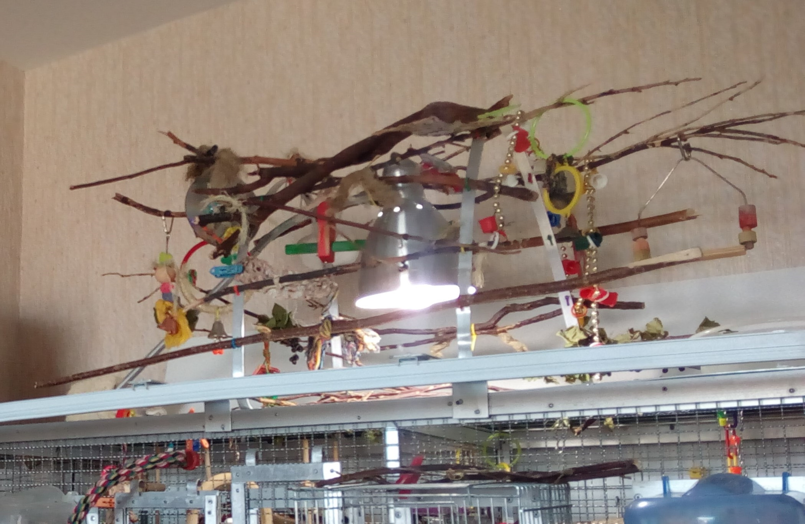 vera-bob Опубликовано 2 сентября, 2018 Автор #37 Опубликовано 2 сентября, 2018 (изменено) Игровая площадка пользуется большой популярностью у пернатых)) Они любят грызть кору на веточках, играть игрушками, уединяться парочками на задних веточках)) Ветки очень легко менять по мере погрызания коры)) Игровой стендик сейчас служит ещё и опорой для лампы ARCADIA - сделала специальный крючок, на который повесила светильник. Эта лампа практически не нагревается - от неё идёт слегка тёплый воздух, поэтому никто не обожгётся. Но над таким теплом хорошо сушиться после купания, что птички и делают))) Садятся на веточки над лампой и начинают после купания красоту наводить - пёрышки перебирать)) Изменено 2 сентября, 2018 пользователем vera-bob