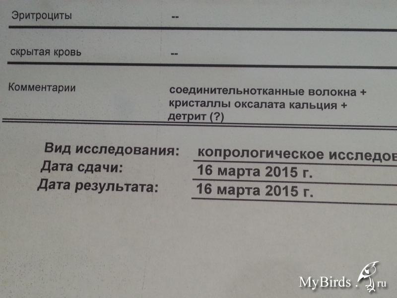 KamaRo Опубликовано 20 марта, 2015 #42 Опубликовано 20 марта, 2015 Выложите фото нынешнего помета. У крупных попугаев помет влажный (не сухой как у волнистых).Когда будете сдавать помет, то сделайте копрологию, чтобы не только наличие/отсутствие паразитов увидеть.после антибиотика пробиотик сколько уже даете?