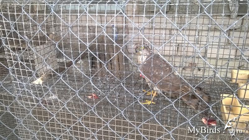 Как птица попала к вам? Это ястреб, кажется, перепелятник. Очень нежная птица в плане кормления и содержания. Никаких хищных птиц не содержат в клетках! Не мучайте птицу. Всех хищников держат на присаде (воспользуйтесь поиском), но если эта птица травмирована, то только в темном месте, желательно в коробке. Говядиной, свининой такую птицу кормить нельзя! Только свежие перепела, птицы из природы. Как долго птица находится у вас? Дайте больше информации.