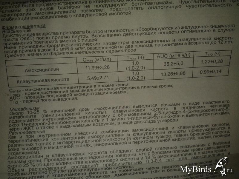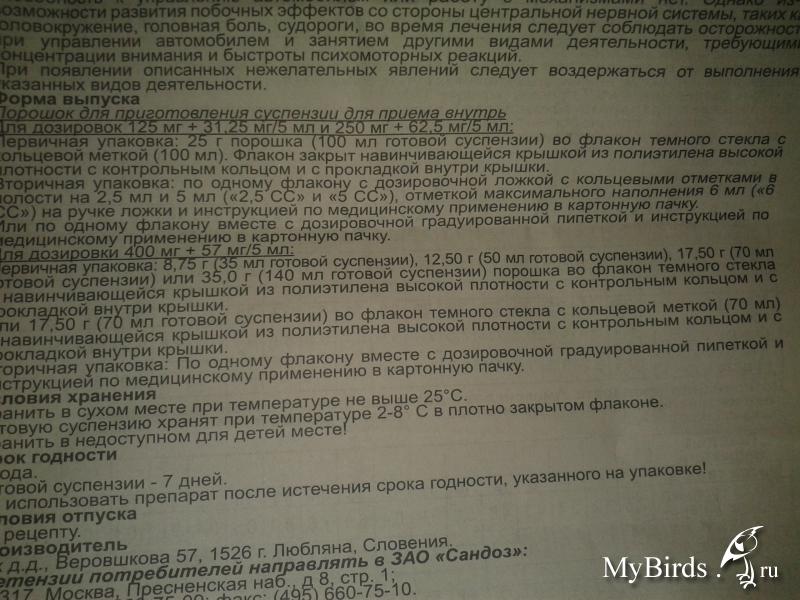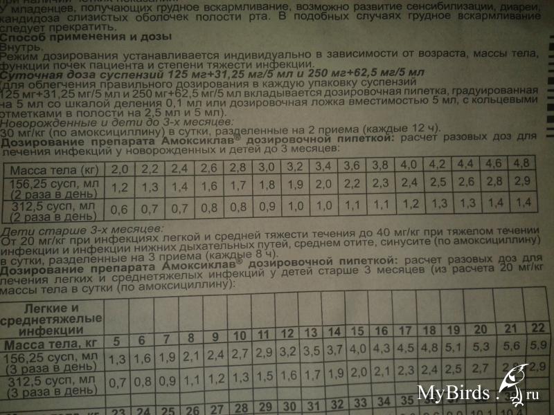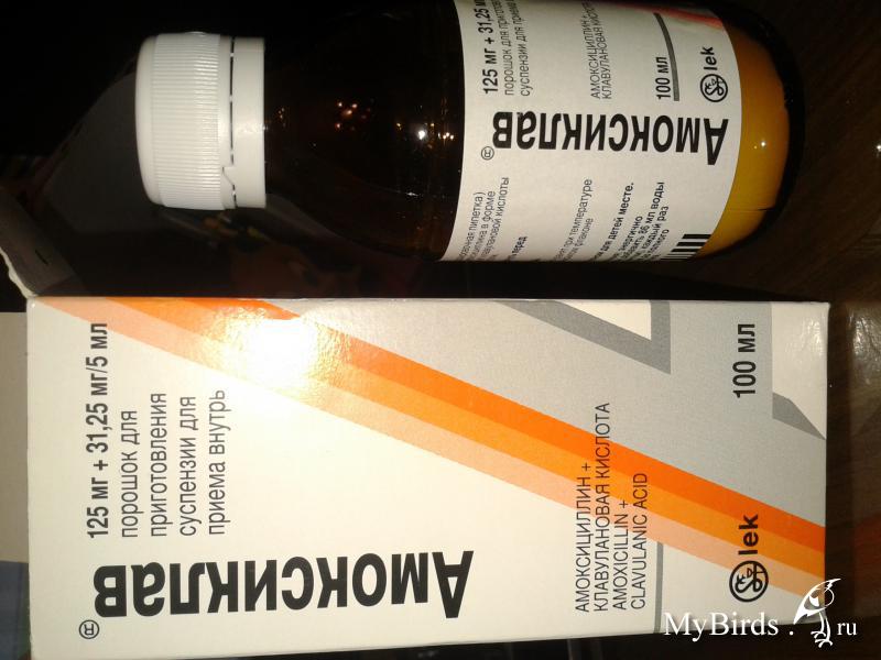 idk Опубликовано 29 мая, 2015 #43 Опубликовано 29 мая, 2015 Один из вариантов. Амоксиклав порошок для приготовления суспензии 125+31,25 мг/5 мл. Все содержимое флакона делите на 4 части, 3 высыпаете обратно во флакон, а четвертую часть порошка ссыпаете в рюмку и добавляете к ней 22 мл воды, в 2 приема, сначала 10, затем еще 12 мл, все хорошо перемешиваете до получения однородной суспензии и даете в клюв по 0.8 мл 2 раза в день. Курс - минимум 10 дней. Второй Купите Амоксиклав порошок для приготовления суспензии, лучше дозировку 125+31,25 мг/5 мл. Делите на 4 части, добавляете до 25 мл воды, в два приема (подробнее о технолгии разведения - в инструкции смотрите). И этой суспензии по 1 мл в клюв два раза в день. Готовая хранится в холодильнике 7 дней. Про вес ничего не сказано.