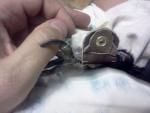 6. Выкройка. Основная проблема в том, что манжеты должны (по крайней мере по моим размышлениям) с одной стороны не туго на лапе держаться, но в тоже время и не болтаться на ней. Так что примерка - "наше всё". Вырезал выкройку из бумаги и одел Рики на лапу. К сожалению успел сделать только одно фото - Рики сорвал бумажную выкройку с лапы. Фото 1 - выкройка на Рики, фото 2 - порванная выкройка на куске кожи.