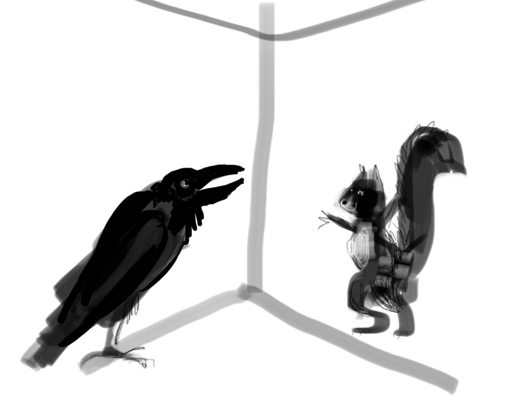 Ольшанка Опубликовано 10 февраля, 2019 Автор #553 Опубликовано 10 февраля, 2019 Я решила взять себя в руки : не брать в руки телефон. Простите за каламбур. Беспощадный iOS регулярно сообщает сколько жизни проходит в интернете, вот я и пытаюсь себя контролировать. БЕСПОЛЕЗНО! так вот, сегодня с утра я решила, что нарочно не буду его заряжать. Пусть полежит разряженный. Такое долгое вступление, а все идёт к тому, как же я упустила возможность заснять забавную историю! Придётся описывать ее словами: Кокоша ходил по полу, подмигивал Снежинке на дровнице; я скучала без телефона на любимом диване. Вдруг в около постучали. Мы с воронами повернули голову и стали всматриваться в кусты... там сидела белка. Кокоша немедленно залез на ветку, поближе к стеклу. Белка перелезла на наружный подоконник. Кокоша бегает по ветке- белка бегает по подоконнику. При этом очевидно, пытается рассмотреть ворона. Кокоша рассердился и стал ее прогонять, барабаня клювом по сетке. Белка заняла удобное место, чтоб горшки с цветами не мешали, поднялась на задние лапы и стала изучать Кокошу. Кокоша тоже замер. Стоят и смотрят. Думают о чём-то, а может мыслями обмениваются. Вообще никто никуда не спешил. После разглядывания белки Кокоша утратил к ней интерес и невежливо спрыгнул вниз, а белка, что-то решив для себя, залезла на куст и стала объедать бузину. А я подумала, как жаль, что не смогу это пересмотреть в записи...вот вам рисунок)))))